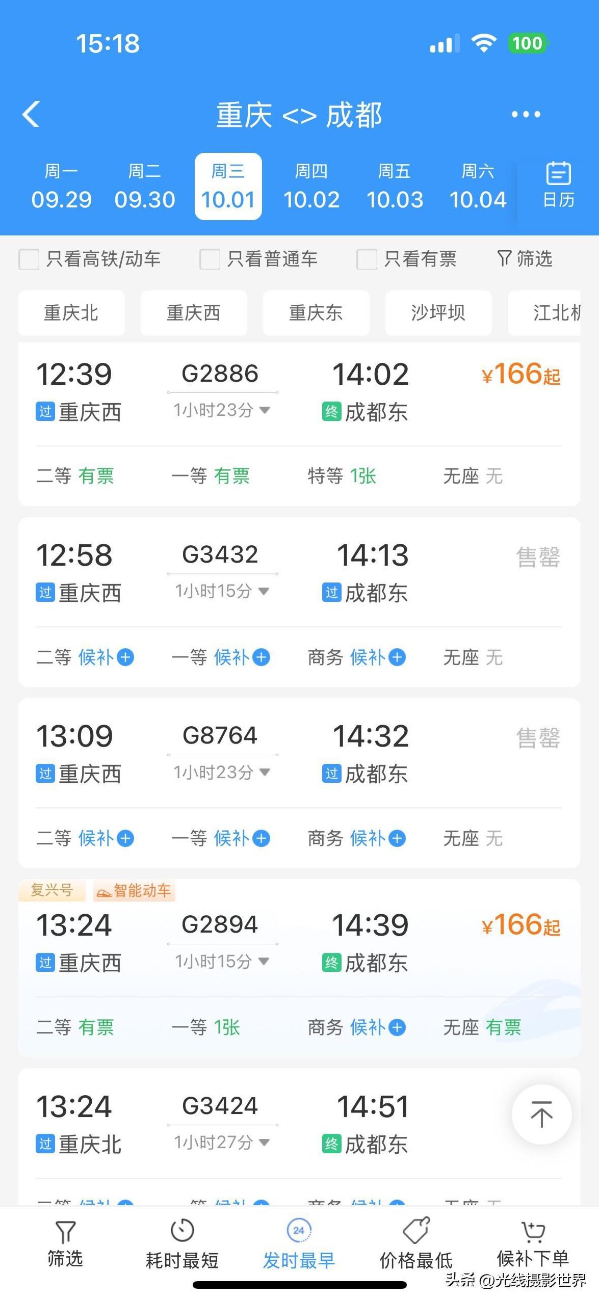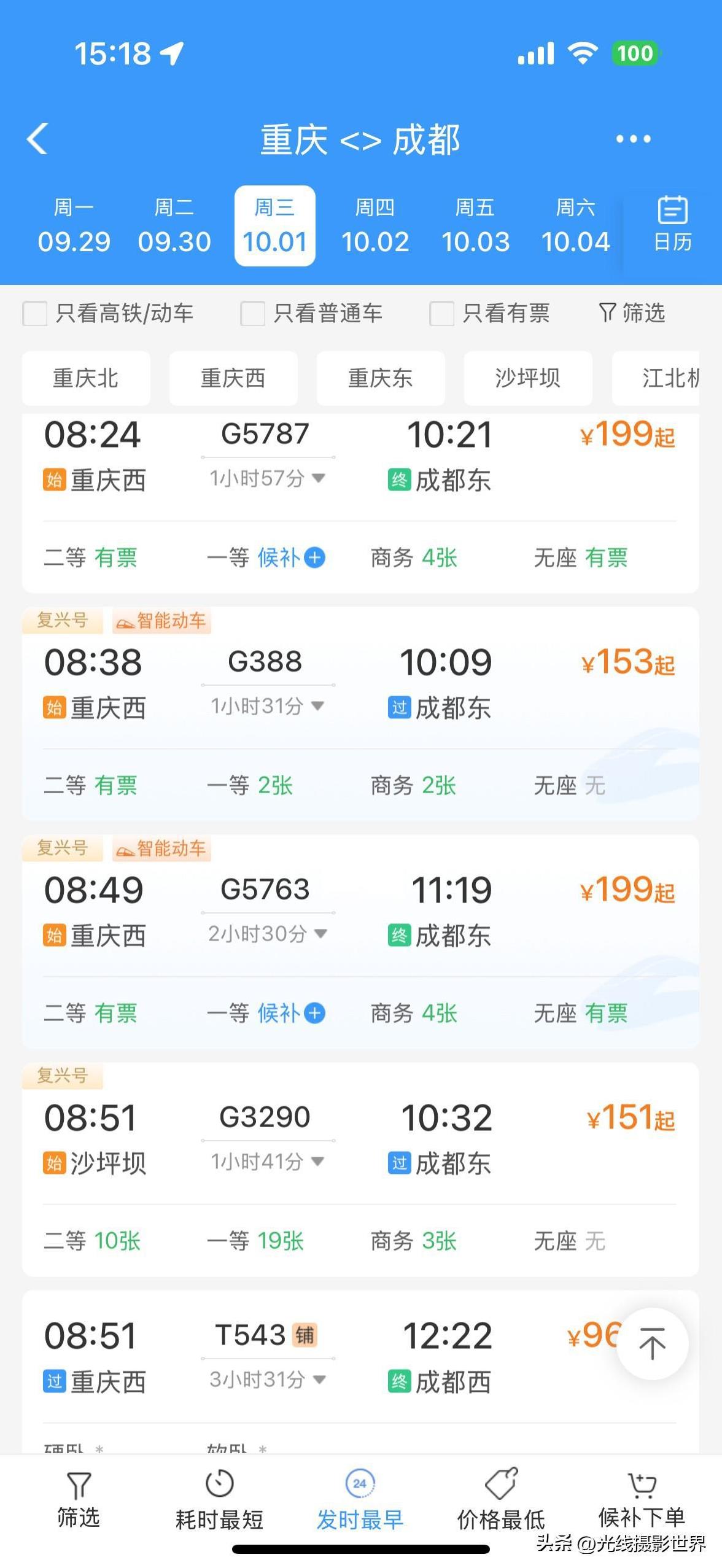 万万没想到,9月30日和10月1日,重庆到成都的高铁动车票,居然还有很多很多!啊啊啊!9月20日,已经可以购买10月4日的火车票了……记忆中,每年国庆节的头两天的重庆到成都的火车票,都是超级超级火爆啊! 可是,9月20日下午,我查询了9月30日和10月1日重庆到成都的火车票……居然每天都有大量剩余火车票……随便买啊! 而且,我又查了成都的酒店宾馆民宿的涨价情况,只是涨价到淡季的3倍左右……而重庆却可以涨价到5-6倍…… 看来,这个国庆节,成都旅游人气,可能远不如重庆火爆吧?! 大家觉得呢?! 或者,难道重庆人,国庆节打算自驾游成都?!打算必须占成渝高速公路的便宜?!#光线摄影世界曾兰谈天说地#