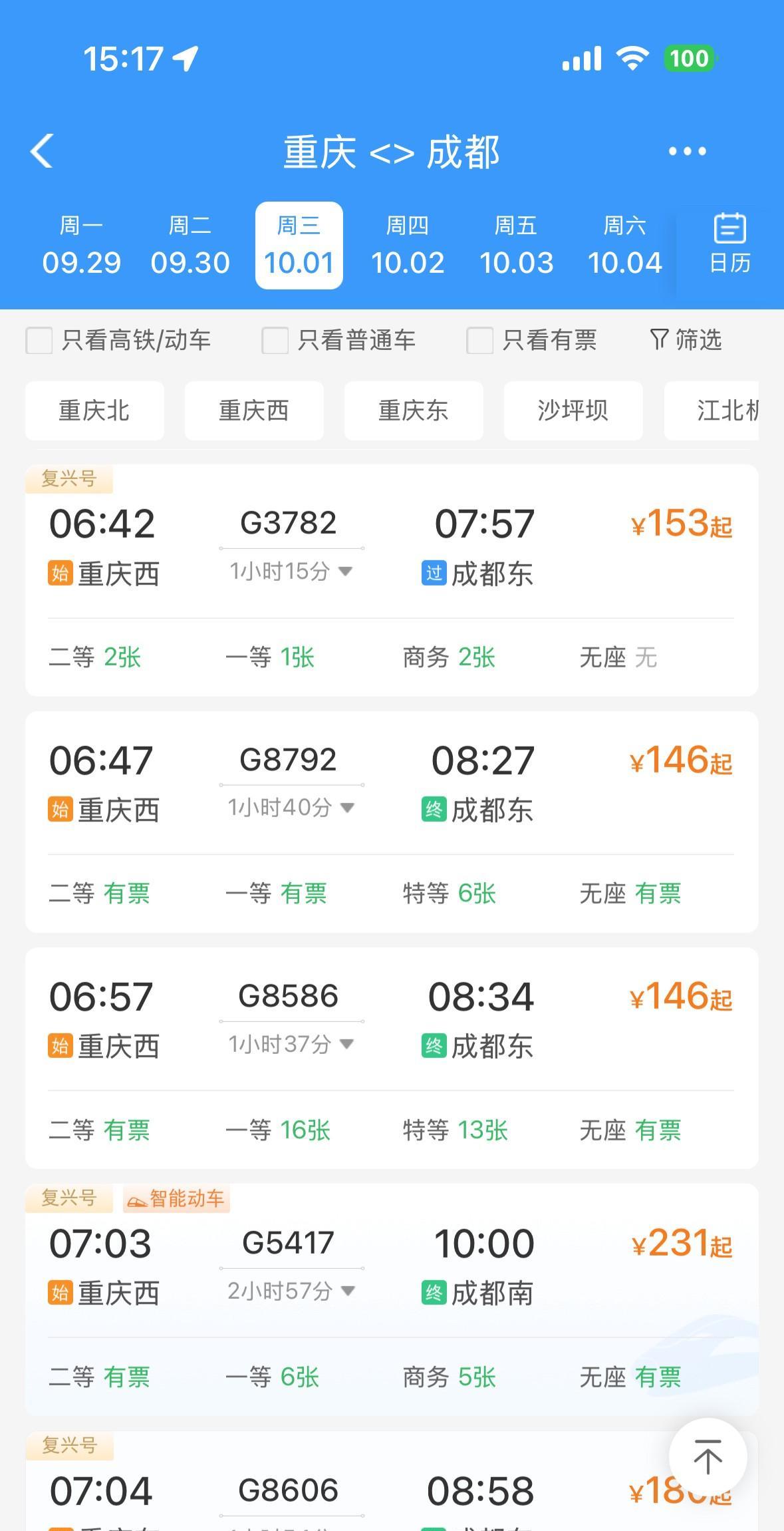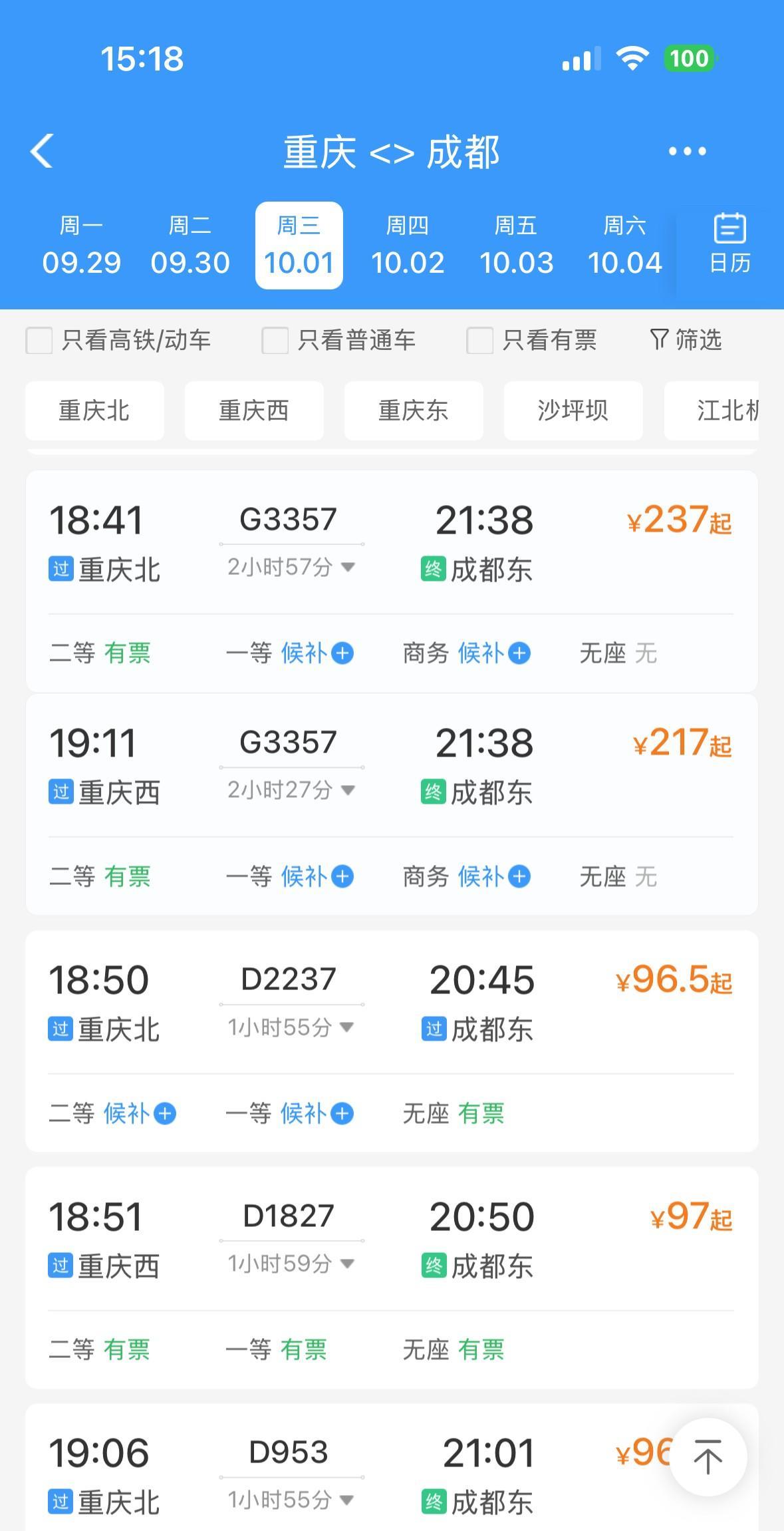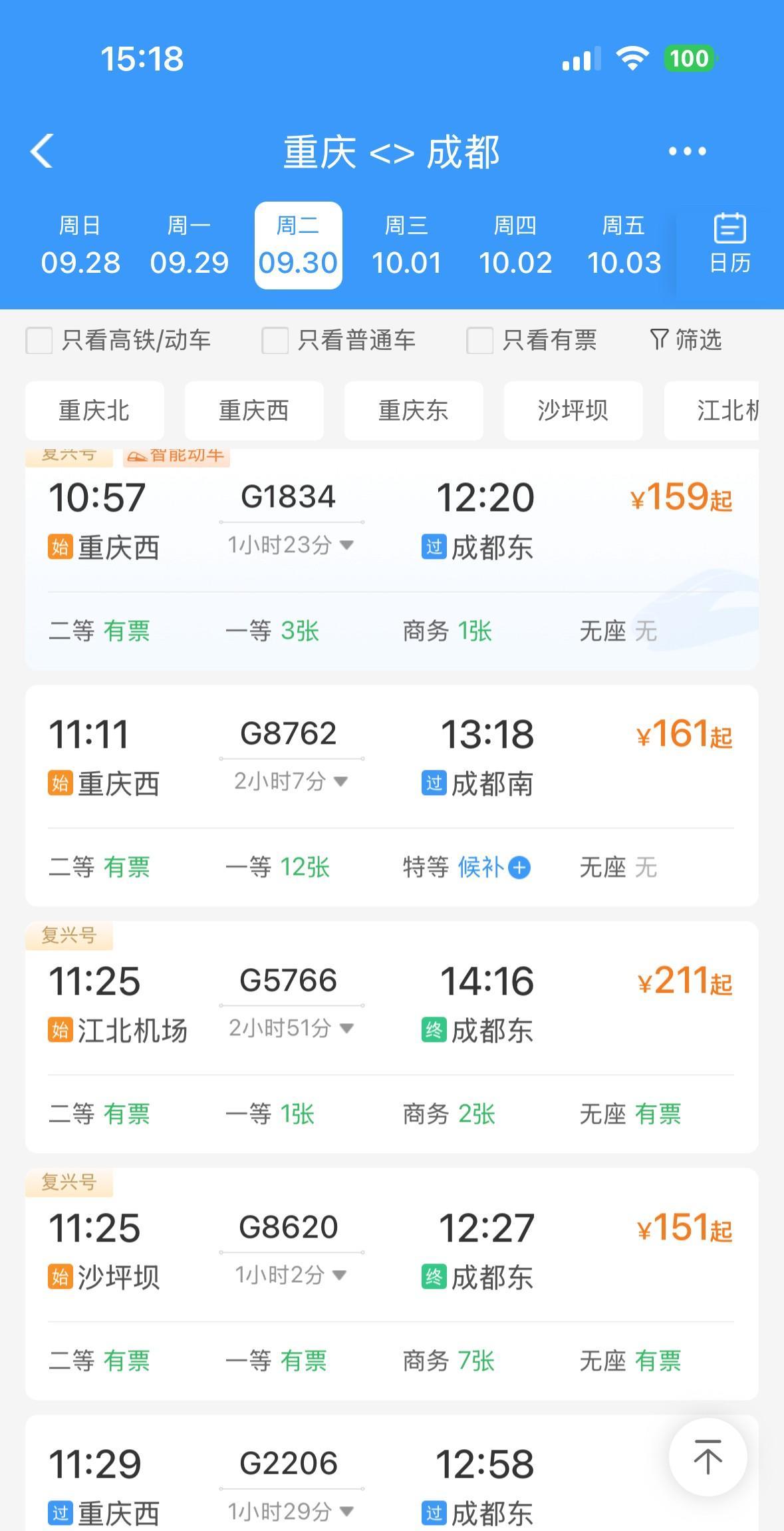 万万没想到,9月30日和10月1日,重庆到成都的高铁动车票,居然还有很多很多!啊