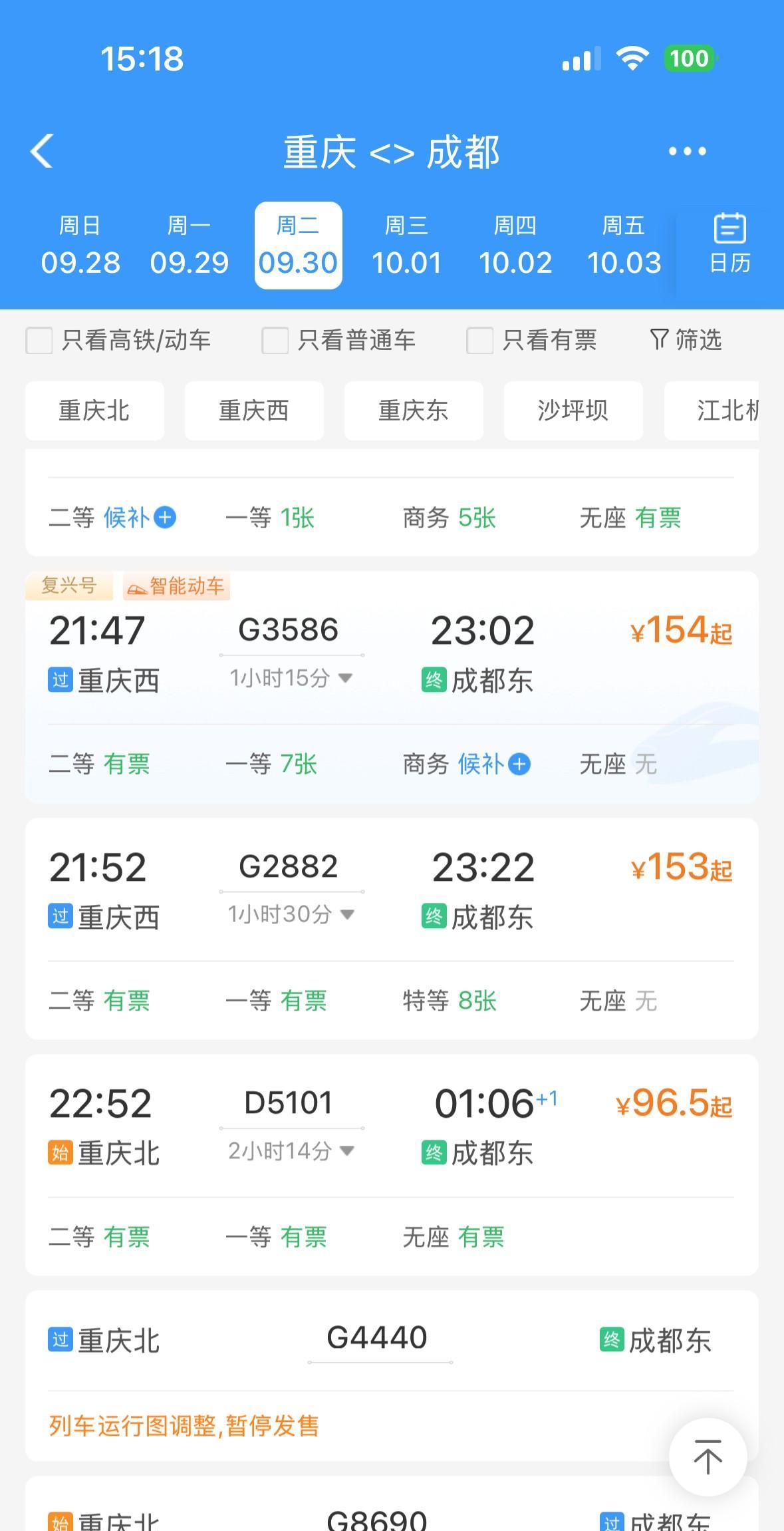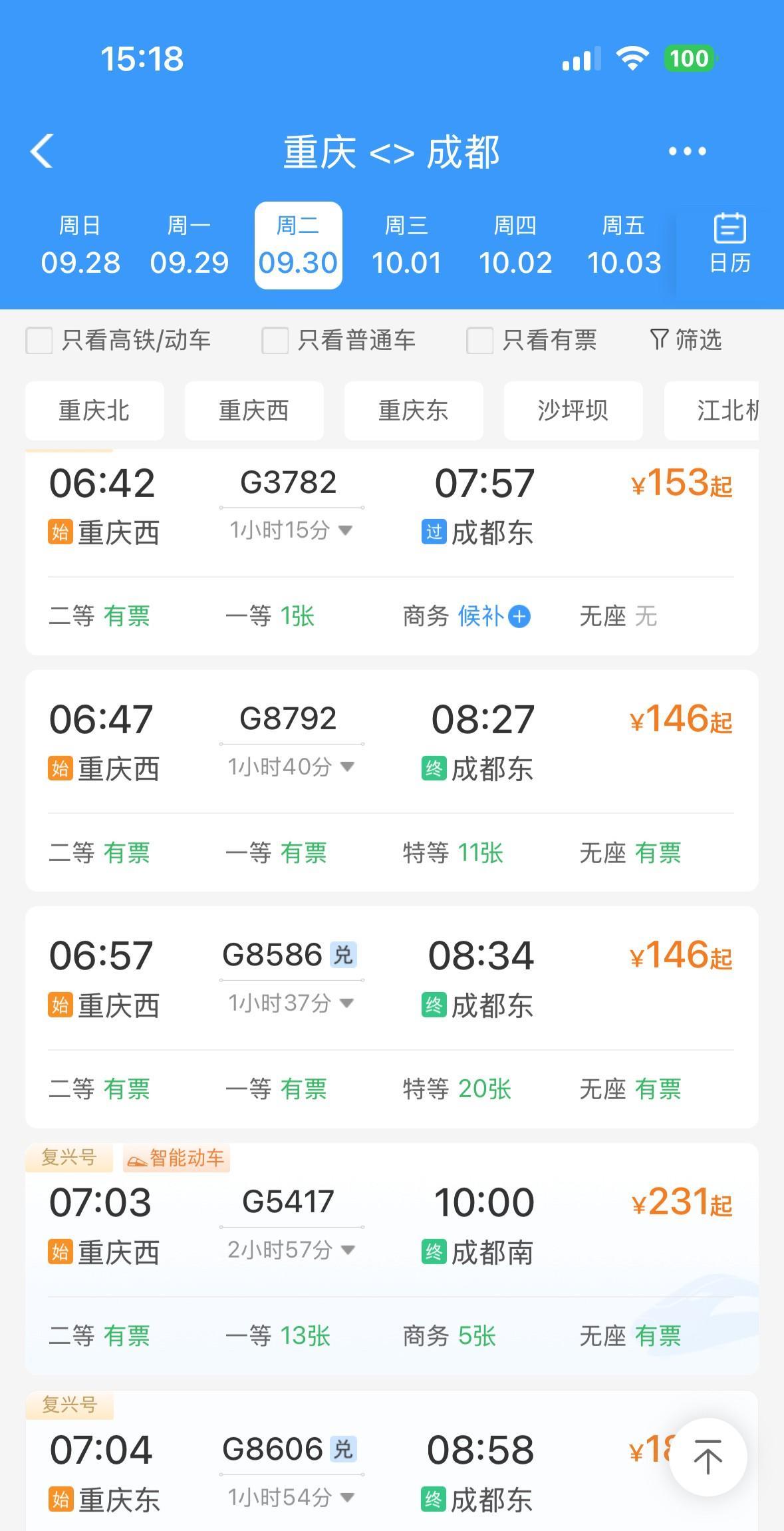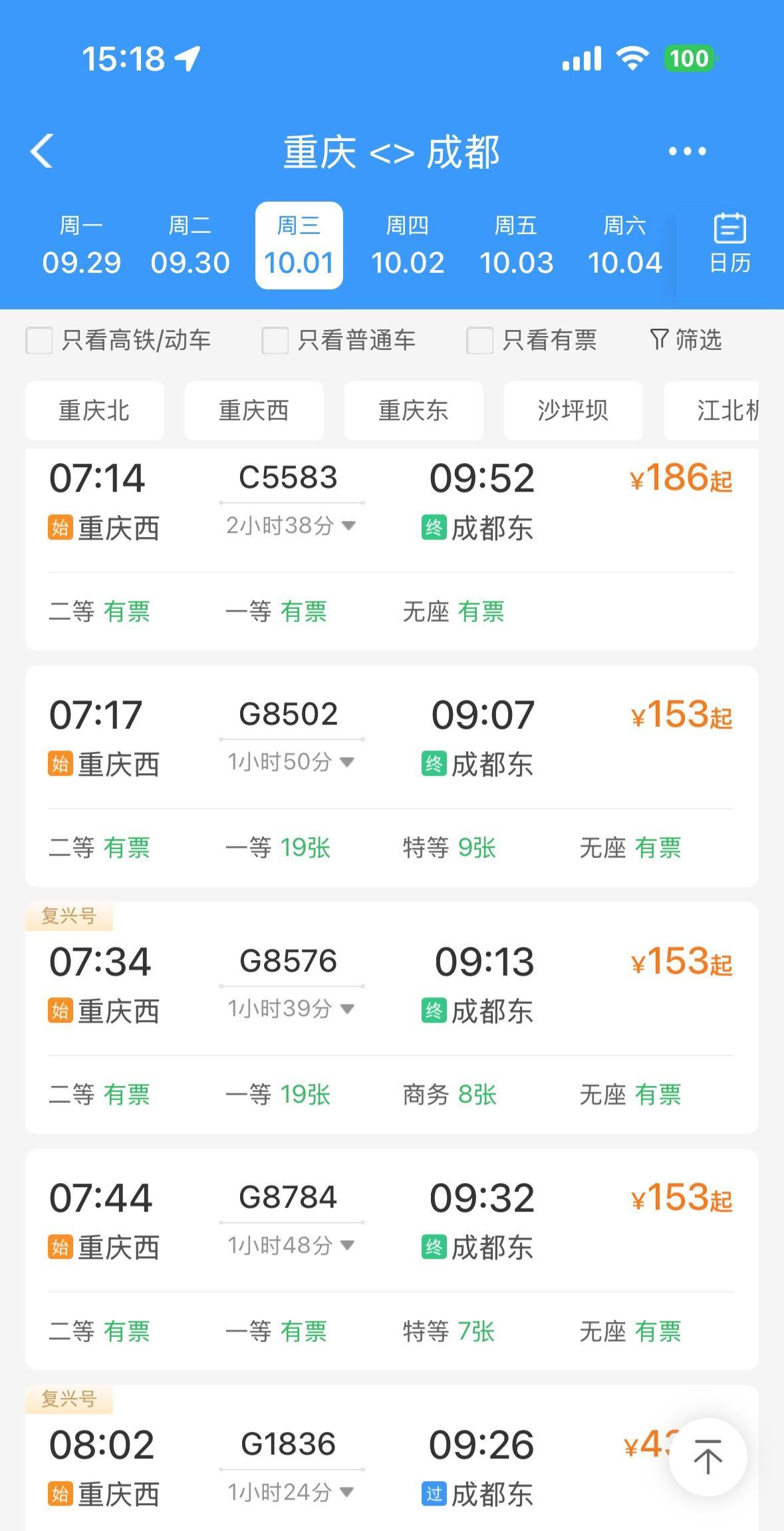 万万没想到,9月30日和10月1日,重庆到成都的高铁动车票,居然还有很多很多!啊