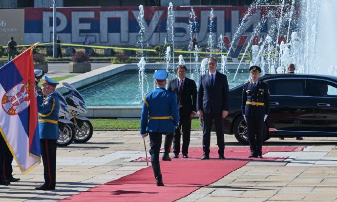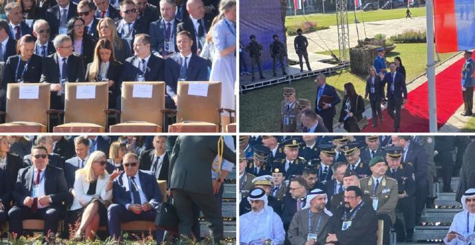 9月20日上午11点举行,也就是咱们的时间下午17点,塞尔维亚阅兵仪式正式开始 从曝光的画面我们可以看出,出现在镜头的有塞尔维亚总统武契奇以及国防部长加西奇。 武契奇和加西奇走过红毯检阅部队,观礼台上也有不少其他国家的嘉宾,其中有阿联酋总统,还有巴林王子等出席了塞尔维亚阅兵仪式。不知道到时候会不会出现中方的装备,这估计也是很多小伙伴们期待的事情。