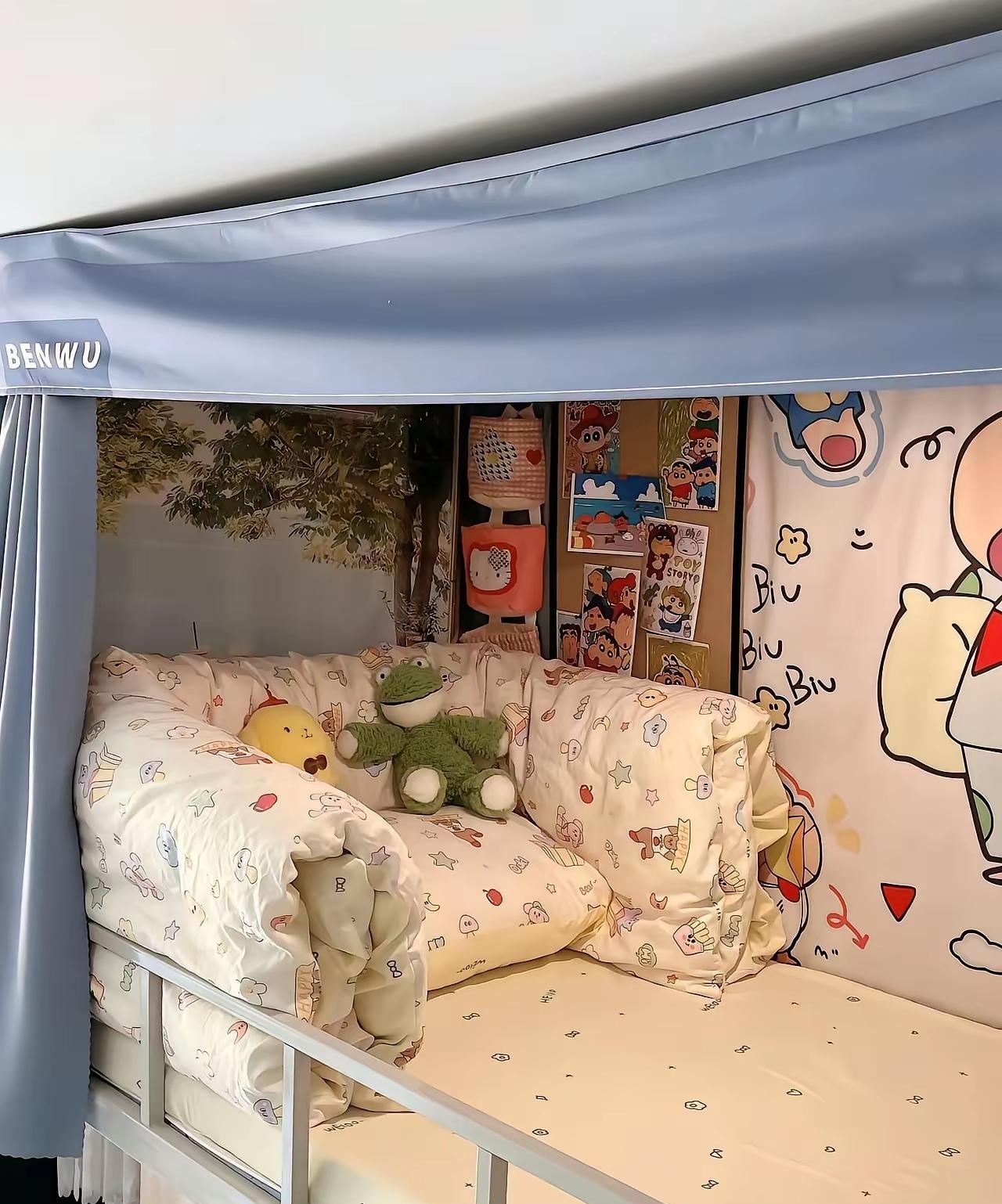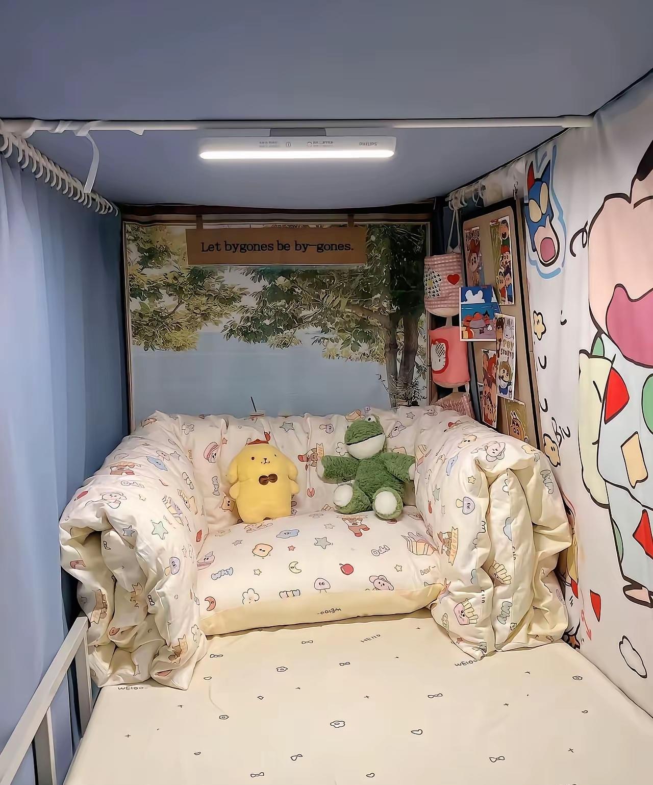 这位大一女生,太有创意了,竟然在自己宿舍的床铺上,用被子和枕头弄出个单人沙发。