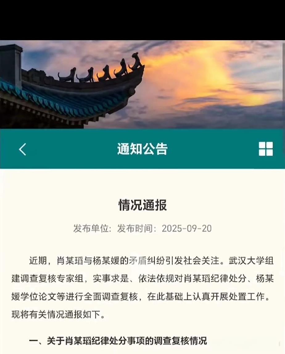 法律给了杨某瑫清白,武大给了杨某媛清白!希望两位年轻人早日从这段不堪回首的经历中走出来,回归正常的生活,开启人生新征程。 武大洋洋洒洒2189字的通报,概括起来就是“1198”:撤销了肖某瑫的一个纪律处分,还了杨某媛一个论文清白,澄清了“杨某媛硕士学位论文被评为优秀学位论文”“网传因肖某瑫遭遇网暴致使其爷爷去世”等9个网传不实信息,处理了8个涉事人员及组织。 该通报之所以今天才发布,是因为等待法院二审判决结果的公布,尽管中院9月17号就完成了维持原判的二审判决,但公布日期是9月20日。武汉大学撤销肖某瑫记过处分的依据有两个,一是“本着充分尊重司法判决的原则”,二是“结合调查复核情况”。注意,武大的用词是“充分尊重”。 编者认为,是法律给了肖某瑫清白,给了大众一个事实真相。是武汉大学经过严格核实,还了杨某媛毕业论文一个清白,尽管该论文存在一定的问题,但没有违反《学位条例》及武汉大学学位授予有关规定,决定维持授予其硕士学位。 编者认为,不信谣、不传谣是网民应该遵循的准则,听风就是雨,道听途说要不得,既有可能伤害他人,还有可能累及自己。