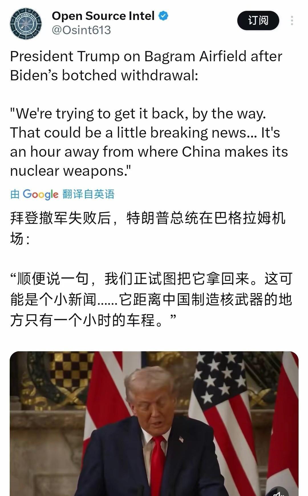 特朗普又开始放话要重新夺回阿富汗巴格拉姆空军基地! 身在英国国事访问的特朗普又开始大放厥词了。他声称要重新夺回阿富汗巴格拉姆空军基地,并驻扎在那里形成对中国的军事威胁。 不得不说,为了对付中国,特朗普真是够煎熬的,当然更辛苦。一天一个想法,目标都是要打败中国。前有放言霸占丹麦的格陵兰岛、巴拿马运河、加拿大、美军驻韩基地产权所有权及现在的巴格拉姆空军基地。 显然,中国正在动摇美国的霸权,特朗普心急如焚,无时无刻不在想办法对付中国,所以才有了特朗普如坐针毡,绞尽脑汁的想办法打败中国。特朗普想归想,但终究美国已经大势已去,剩下的也只有像总统特朗普这样冥思苦想般自虐!
