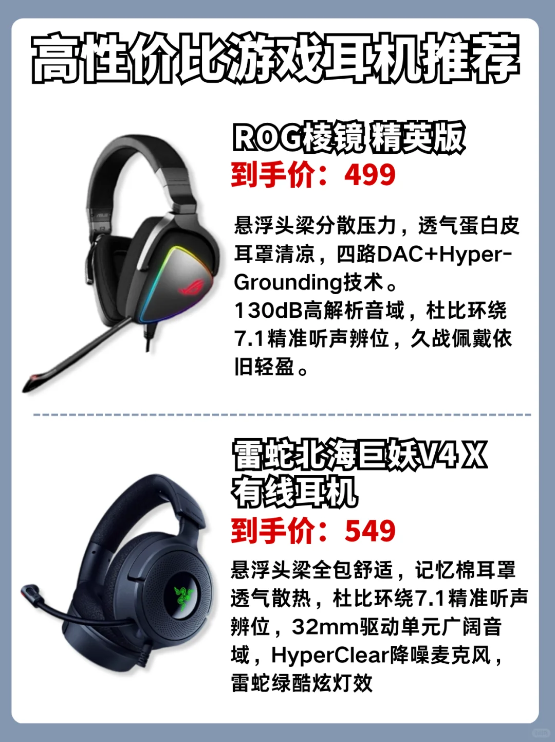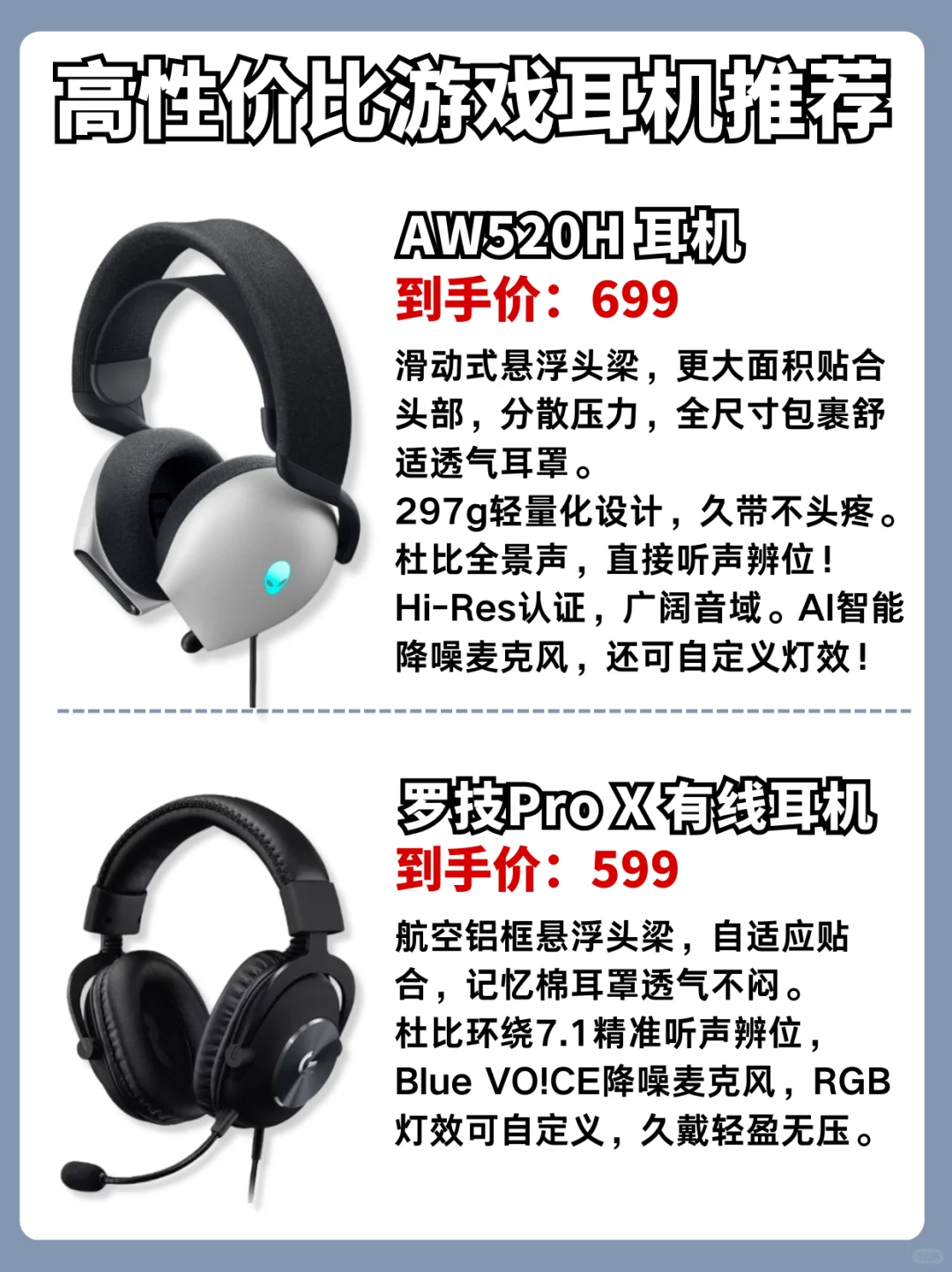 🎮全尺寸包裹舒适透气耳罩,297g轻量化设计,长时间佩戴不头疼