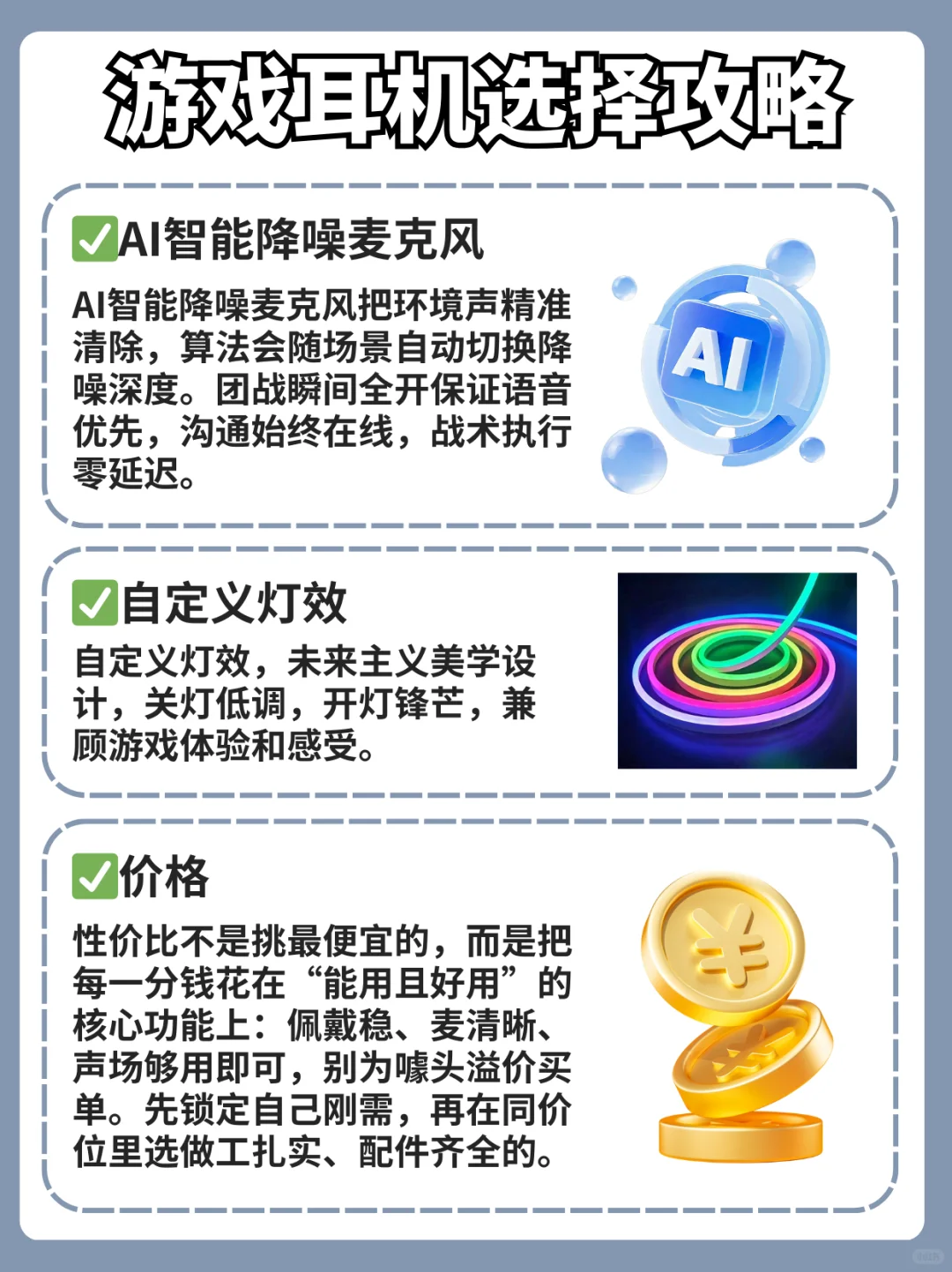 性价比不是挑最便宜,而是把预算花在“能用且好用”的核心:佩戴稳、麦清晰、声场够用即可;先锁定刚需,再在同级里选做工扎实、配件齐全的款,不为噱头溢价买单。