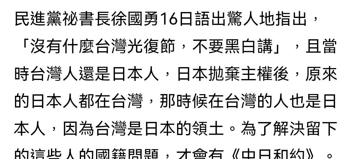 蔡正元博士驳斥民进党秘书长关于日本投降后台湾人仍是日本人的谬论: 他说,日本籍的日本兵在战后都获得“退伍年金或遗族年金”,但台籍日本兵要求同等待遇却被日本政府和法院拒绝,理由是“台籍日本兵不是日本人”。 并且,日本的法律上,台湾人称“本岛人”,日本人称“内地人”,日本人有日本国民权利,但台湾人没有日本国民权利,这样的台湾人也是日本人吗? 蔡博士直言,或许应该说,徐国勇虽然不是日本人,日本也不认为他们是日本人,但他们心中始终想做日本人,干脆幻想自己曾是日本人。 [机智]评:徐国勇之流就是精神日本人,也即精日分子,但比精日分子更无耻,他完全无视当初国民政府接收台湾时台湾人欢天喜地的场景,沈富雄还拿出1946年小学一年级国文课本第一课的内容,就是教他们既是台湾人也是中国人,蔡正元博士也拿出铁证证明日本根本不认台湾人为日本人,而是当成殖民地人民,享受不了日本人的国民待遇。