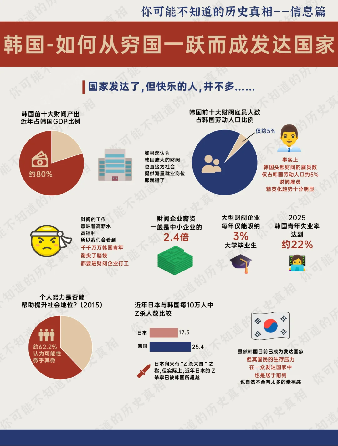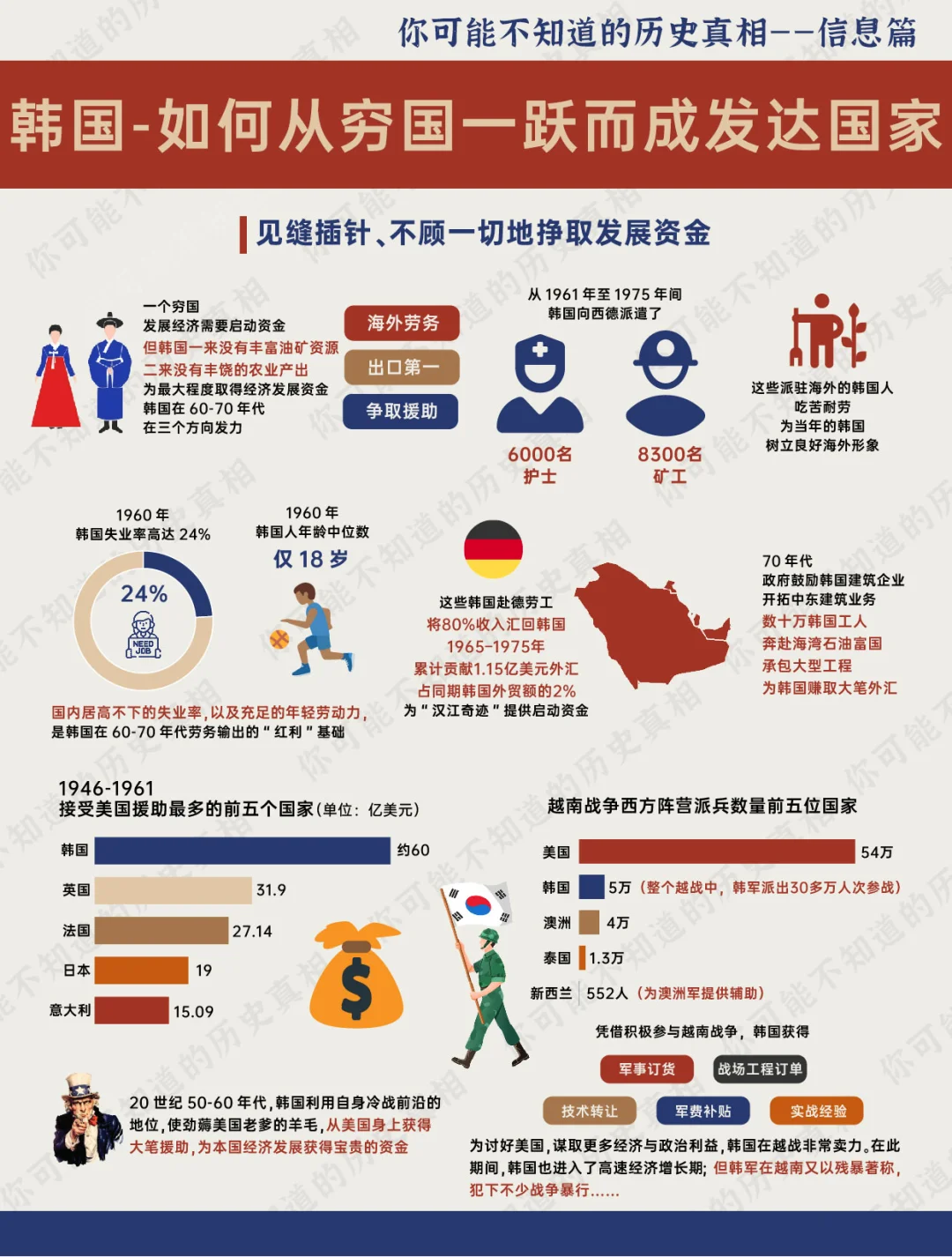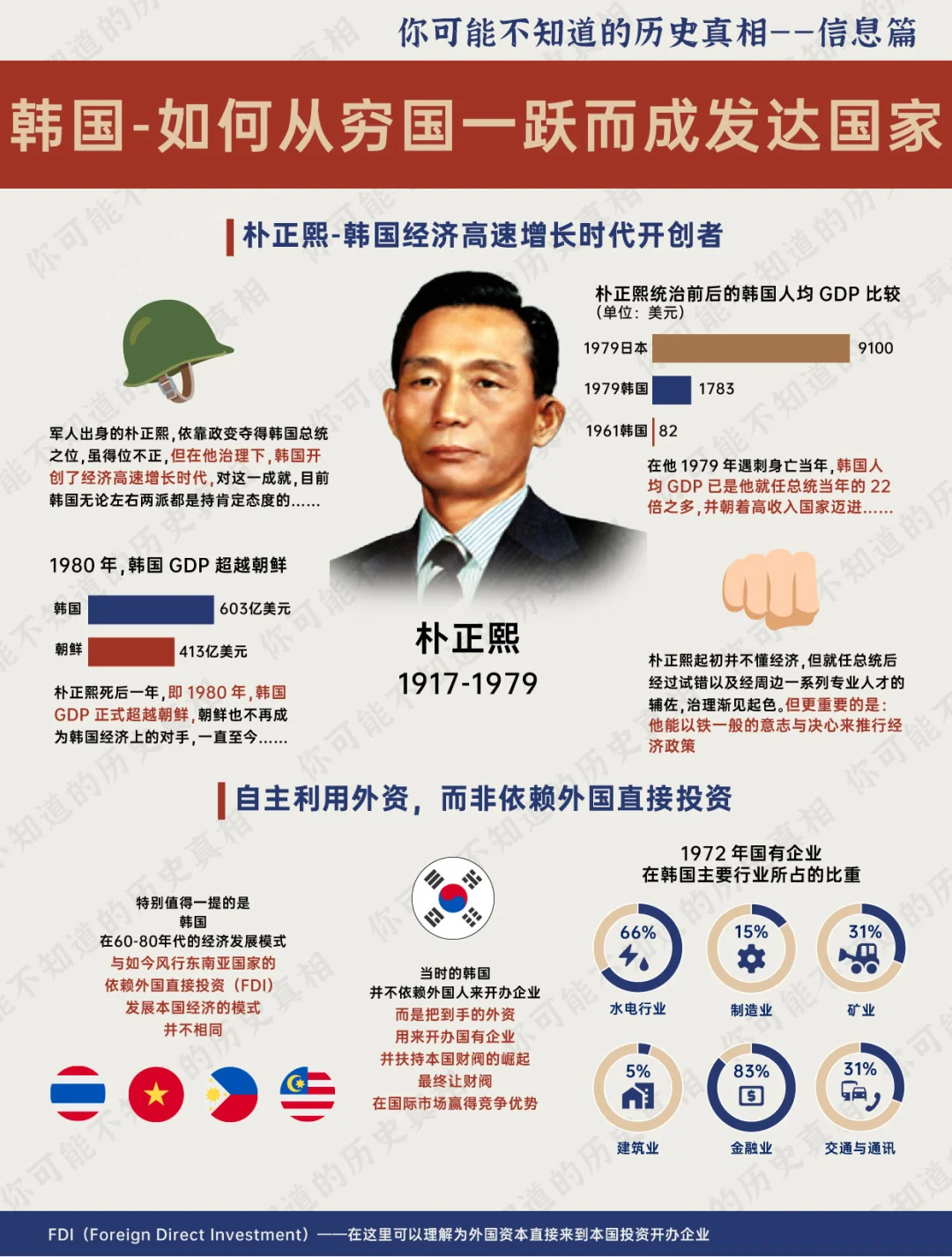 70多年前的朝鲜战争 也许当时来自各国的参战士兵们 并没有想到: 脚下这个战乱不断,贫穷落后的小国——韩国(南朝鲜) 在战后仅用了40多年,就成为全球高收入国家,并晋身为发达国家的一员 韩国 仅仅用了一代人 就从贫穷潦倒的不发达国家 一跃而成亚洲仅有的四个发达国家之一 可谓是一段传奇 历史 世界历史 韩国 朝鲜 朝鲜半岛 朴正熙 汉江奇迹 发达国家 财阀 日本 若无朴正熙,韩国能有今日繁荣? [PK]