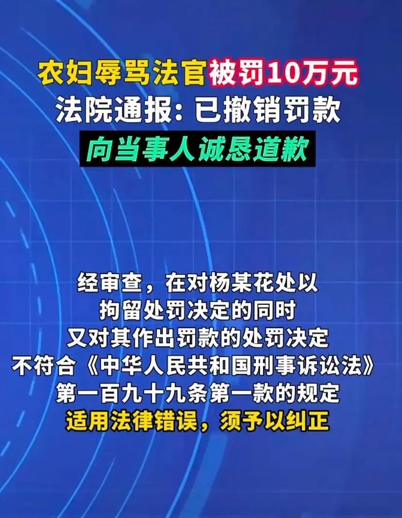 山东辱骂法官被罚款10万的农妇的案件。法院已经撤销罚款已经向当事人诚恳道歉,知错