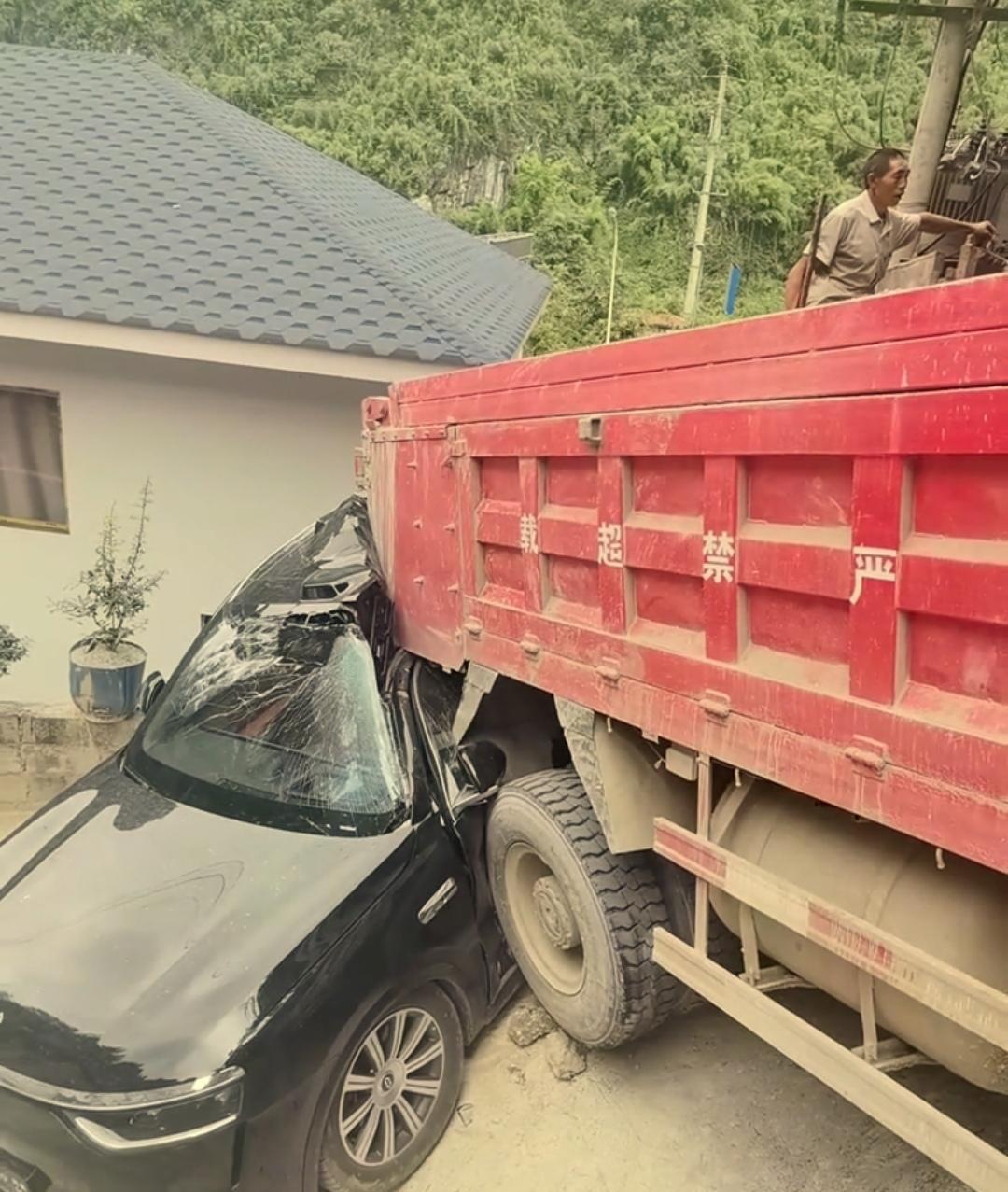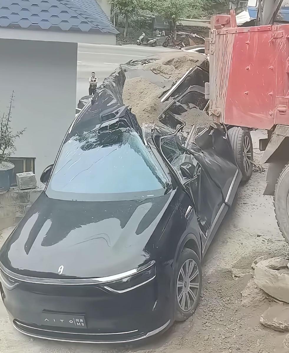 难怪问界M8卖得这么火,连满载沙石的货车都能硬扛,有钱谁不想整一辆啊。 一辆满载沙石的货车,在30°的陡坡上刹不住车溜了下来,4米2的车身自重5吨左右,加上满载的沙石,再加陡坡上溜下来的冲击力,妥妥超过30吨的重量,撞上了问界M8的侧身,而问界M8除了AB柱变形,其它地方基本完好。 难怪问界M8能卖爆,周销量4700辆,远超问界M9、奔驰GLC、领克09和理想L9等,位居榜首,这颜值、这空间、这智驾、这质量,有钱谁不想买一辆?