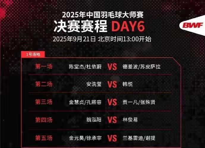 中国羽毛球大师赛今天将进行五个单项的决赛,中国的在男单、女单和女双晋级决赛,翁泓阳、韩悦、贾一凡/张殊贤分别对阵林俊易、安洗莹和金慧贞/孔熙容,男双中国队无人晋级四强,决赛是韩国名将金元昊/徐承宰对阵印度“黑塔组合”兰基雷迪/谢提,他们在半决赛分别2-0战胜了印尼组合阿尔菲安/菲克里和马来西亚组合谢定峰/苏伟译,混双方面,中国队两对组合都在半决赛输球,决赛是马来西亚组合陈堂杰/杜依蔚对阵泰国组合德差波/苏皮萨拉。