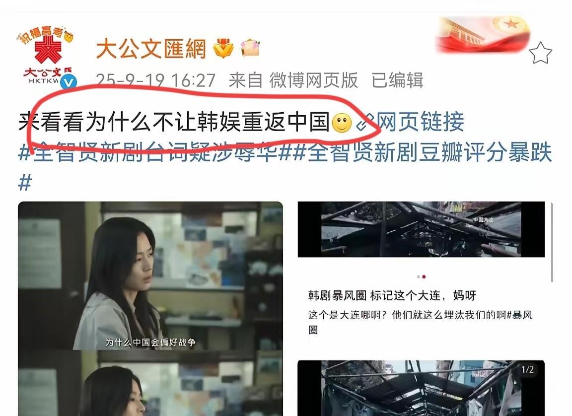 当香港《大公文汇网》发文时,我们是否意识到,对泡菜国太仁慈了?是时候该敲打敲打韩娱了… 我觉得就是我们太包容了,因而导致对方得寸进尺,大家看,全智贤的电影,这种台词都敢说出来,说明根本就没把我们放眼里吧? 大家应该明白一个道理,有些人越是顾及其脸面,越是包容对方,其则越是得寸进尺!因此,只有狠狠的教训其一顿,对方才懂得尊重,而泡菜国就是这种性格! 所以我觉得,我们不应该做烂好人了,对待与我们友好的人,我们就尊重他,对待我们一而再再而三在背后偷袭、嘲讽的,这是他自己不给自己留余地,我们干嘛还惯着?