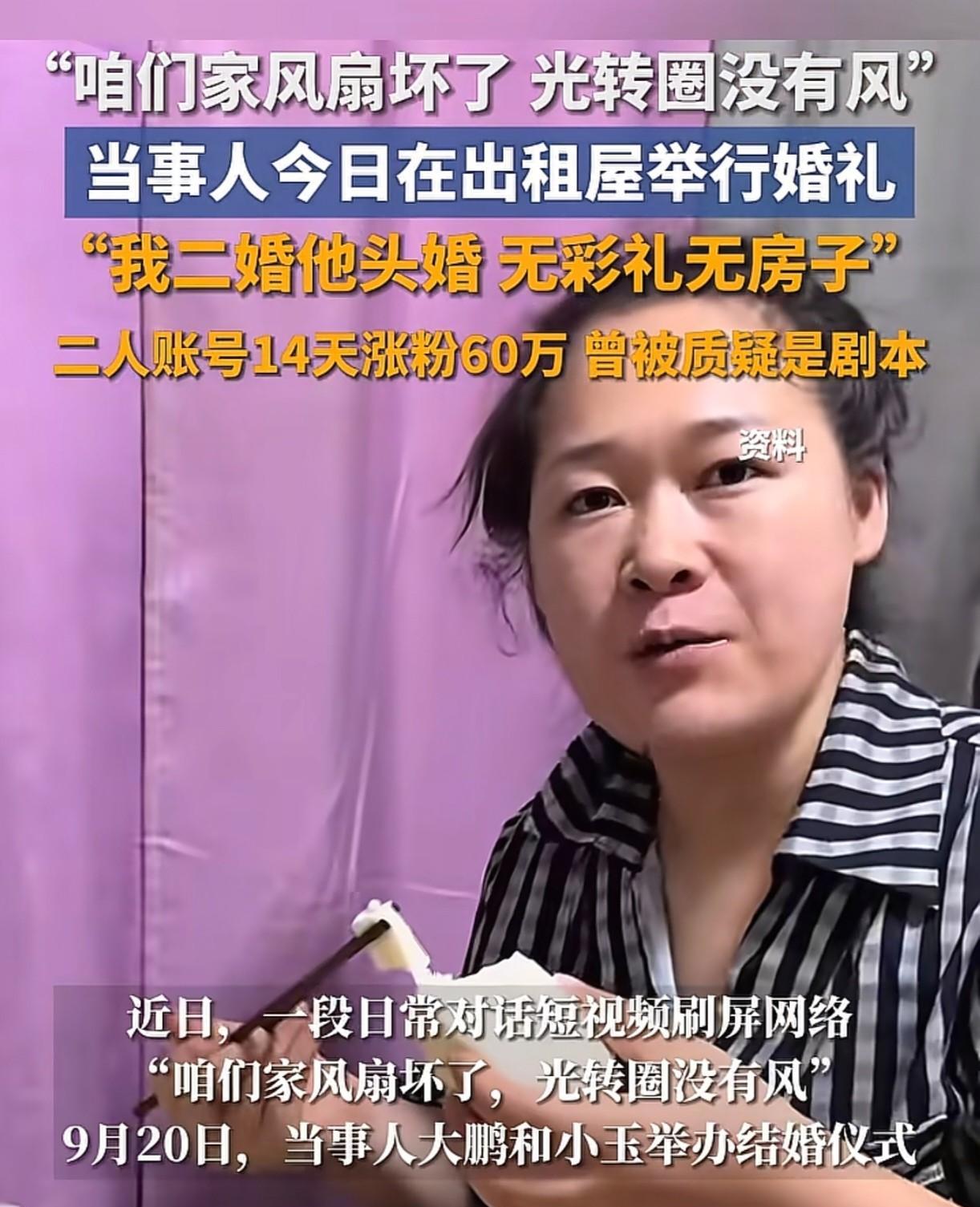 看完火遍全网的“大鹏和小玉”结婚一事,她为什么会在胸口塞一张A4纸? 只能说,她太懂规则了,她知道衣服领口太低,露一点点平台都会限她流,甚至封号,所以她还特意拿胶带粘稳。 虽然她一口咬定自己的结婚一事不是剧本,和大鹏在一起相依为命真的很艰难,所以结婚才选择在出租屋,甚至不要彩礼。 但我把她所有视频都翻了一遍,显示最早的一条视频是2024年4月发的,一眼就能看出,她对做账号有研究过,她所有内容都是围绕故事片去开展,突出的一个主要核心内容就是以“惨状”去感动人。 且不说她的经历是真还是假的,但有一点是可以肯定的,她好不容易火了,不用多久就会直播带货了。