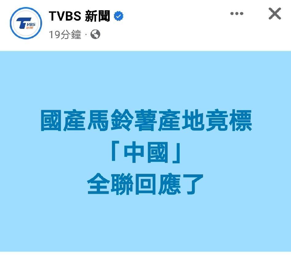 台湾省商超“国产马铃薯”产地标中国,遭青鸟出征! 这两天,台湾省最大的商超之一全联因将“国产马铃薯”的产地标“中国”,遭到青鸟出征辱骂,说全联被大陆渗透,“台湾已经被中国(大陆)统一了吗”,全联是“中共同路人”等,全联最后发声明致歉,说标识错误,会更正! 这帮低能青鸟和软骨头全联。