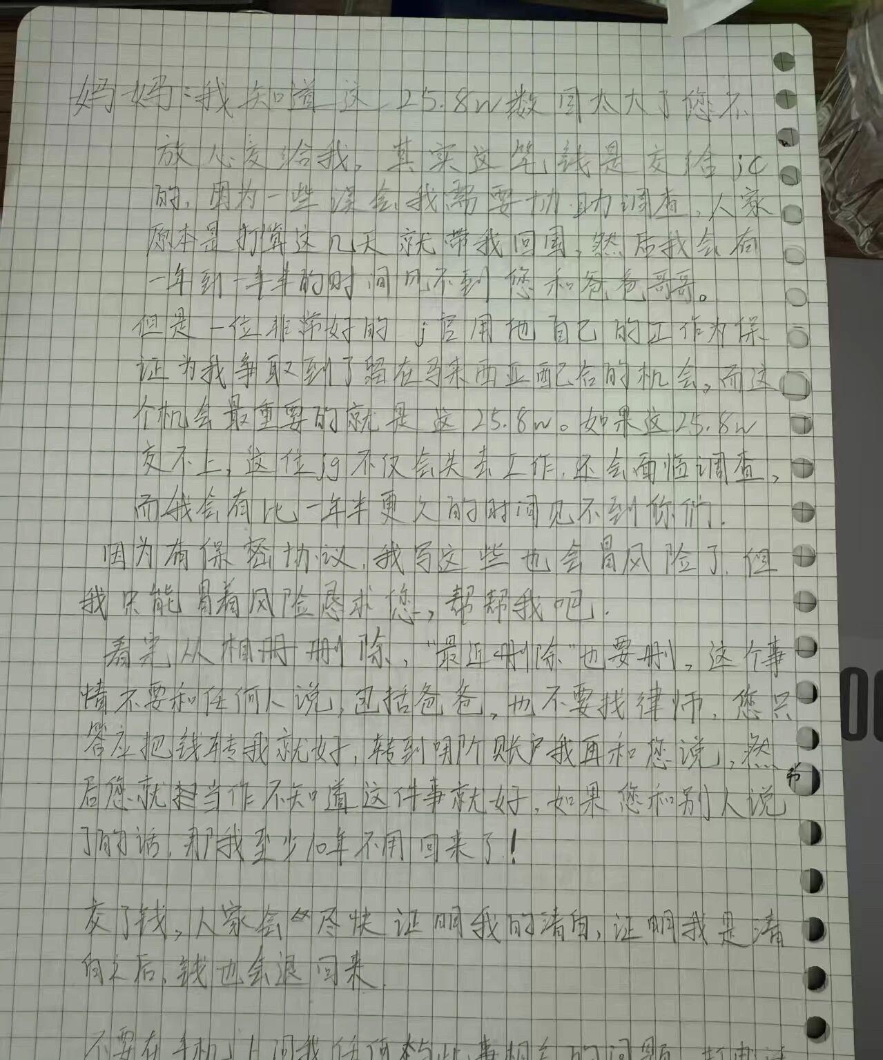出国留学九天被骗后跳楼身亡的19岁女孩,离世前手写了一篇长文发给妈妈,只可惜,随后又立即撤回了。仅仅几个小时后,她就选择了轻生! 这个女孩名叫小雯,出生于2006年。 2024年她参加了高考,因发挥失常,最终只取得了400多分的成绩,最终,无缘国内本科大学。 为了更好的发展,家里人做出了送她去马来西亚留学的决定。对此,小雯也很开心,她早早的规划好了:在那边的学校拿到博士学位后,就回国工作,然后,找一个工作好好存钱,孝顺爸妈。 然而,谁也想不到,一切才刚刚开始,悲剧就发生了。 刚到马来西亚,小雯就接到了诈骗电话。对方告知她,她的手机号码涉嫌参与了一起诈骗案,从而导致一个老人自杀。 接下来,又有一个自称是国内警察的人联系她,说会用他的工作替她暂时担保。但如果不缴纳25万多的保证金自证清白,不仅他的工作保不住,她也会失去自由。 于是,在那几天的时间里,她被对方彻底洗脑,真的相信了。 跳楼自杀前几个小时,她给在山东老家的母亲打去了电话,寒暄几句后,就问母亲家里有多少钱,母亲回答说没多少钱,就够你上学用。接下来,她坦白了自己的困境,当时母亲就告诉她是遭遇了诈骗,让她不要理。 电话结束后,她给母亲发去了手写的长文照片,但过后又很快就撤回了。当天, 她便选择了轻生。 可怜的小雯,真的太单纯了,她至死都没想到自己是遭遇了电信诈骗! 她妈妈没有工作,爸爸生意垮了后靠开顺风车维持生计,老两口省吃俭用,用家里仅有的一点积蓄供她出国留学!然而,这个举全家之力送出去的留学生,只在国外待了9天时间生命就不在了![流泪][流泪][流泪] 通过这个悲剧,希望大家都要提高防诈意识,绝不要轻易相信陌生来电![祈祷][祈祷][祈祷]
