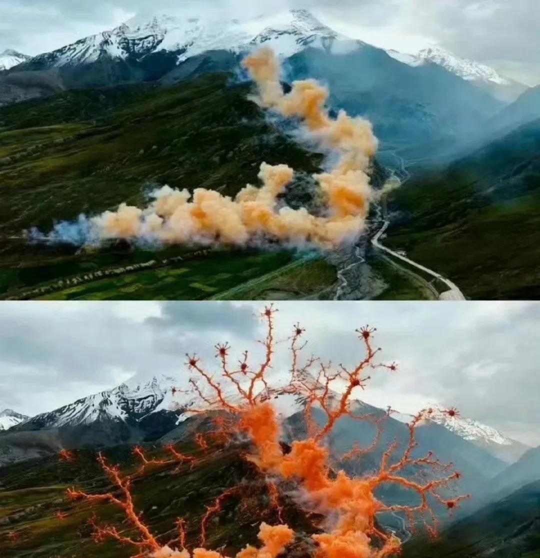 蔡国强与始祖鸟在喜马拉雅山放烟花,放烟花的雪山山脚围栏边,赫然放着“禁止吸烟”的