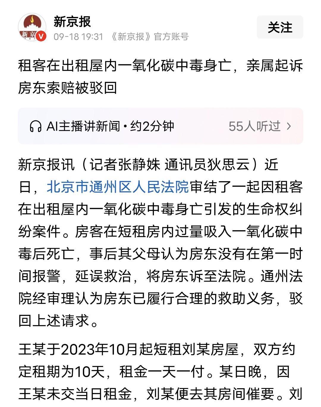 北京,男子把房子短租给一租客10天,租金一天一付,某天晚上10点,男子去收租金,见租客睡觉便没打扰,次日中午,男子去要房租,发现租客还和头一天一个姿势,顿觉大事不好,赶紧报警,经查,租客屋里有烧烤炉和未烧完的碳,是一氧化碳中毒身亡,租客父母却怪房东没第一时间报警,把房东告上法院,索赔8万元,法院判决大快人心。 2023年10月,刘某有套房正在出租,来了一个王某说要租10天,面对这种短租,刘某也没别的要求,和王某说好租金一天一付。 原本这只是一次普通的短期租赁,可刘某怎么也没想到,一场悲剧正在悄然降临,给他带来好大的麻烦。 一天晚上10点左右,刘某想起租客王某还没有支付当日的租金,当时说好一天一付的,这不能拖延啊。 于是,刘某便去王某的房间要租金,当他轻轻推开门,看到王某躺在床上,心想既然他睡着了,那就别打扰了,回头再要吧。 刘某便悄悄的走了,回去睡觉了。 第二天中午,刘某忙完自己的事,又来到王某的房间,打算让他支付头一天的租金,进屋后,他发现王某的姿势和头一天晚上一样,看样子根本没动过…… 刘某突然意识到大事不好,赶紧上前查看,喊了两声没有回应,再一探鼻息也没了,吓得他赶紧报了警。 经过公安机关调查,王某所租的房屋内有一顶帐篷,屋里还有烧烤架和没有烧完的炭块。 另外,王某手机搜索记录中有他查询“烧炭失败”的内容。 因此,认定王某是吸入一氧化碳中毒导致死亡。 可是,王某突然离世,他的父母无法接受这个噩耗,他们觉得刘某作为房东没有尽到安全保障义务,没有在第一时间报警,所以,导致了王某没有得到及时救治。 事后,王某父母一纸诉状将刘某告上法院判决索赔8万元。 刘某怎么也没想到,自己把房子租给王某,他一离世,房子里出过事以后租售都有影响了,王某父母还让自己赔偿丧葬费、精神损失费等8万元,这简直是哑巴吃黄连有苦说不出啊! 王某父母认为刘某作为房东未尽到安全保障义务,法院会怎么认定呢? 《民法典》第1198条第一款:宾馆、商场、银行、车站、机场、体育场馆、娱乐场所等经营场所、公共场所的经营者、管理者或者群众性活动的组织者,未尽到安全保障义务,造成他人损害的,应当承担侵权责任。 刘某作为房东,应尽的安全保障义务的限度是“合理范围内的注意”。 也就是说,房东要确保房屋结构安全、水电正常,但不可能24小时盯着租客。 本案中,房东刘某发现租客王某躺在床上以为他睡觉便没打扰,属于正常反应。 次日,刘某发现王某异常后立即报警,已尽到救助义务。 王某自己烧炭中毒,是主动冒险行为,房东刘某无法预见和控制。 租客王某是成年人,明知烧炭可能一氧化碳中毒,其还用手机还搜过“烧炭失败”等内容,却主动在密闭空间烧炭,属于自甘风险。 《民法典》第1165条规定:行为人因过错侵害他人民事权益造成损害的,应当承担侵权责任。 法律上,这种行为叫“过错自担”,也就是说你自己故意或疏忽导致损害,不能怪别人。 因此,王某父母认为房东刘某未在第一时间报警,导致王某延误救治,是不合理的。 《民法典》1165条第2款规定:依照法律规定推定行为人有过错,其不能证明自己没有过错的,应当承担侵权责任。 王某父母想“甩锅”给房东刘某,但法律上要证明两点: 一是房东“知道或应当知道”租客有危险。 二是房东“有能力救助却故意不救”。 本案中,房东刘某晚上10点看到租客躺在床上睡觉,以为是正常休息,没有打扰。 第二天,刘某发现异常后立即报警,并拨打120,已经尽到合理救助义务。 所以,从现实角度来说,不能要求房东“未卜先知”,更不可能要求房东24小时盯着租客的安全。 最终,法院判决:驳回王某父母的诉求。 王某父母不服上诉,二审维持原判。 有人说,晚上十点多室内闯入一个人,作为正常人肯定会有反应,房东没发现租客的症状,是不正常的,耽误了救治的时间,有见死不救的嫌疑。不正常死亡的居室会影响租金和出售的。 也有人说,在室内烧碳就相当于自我了断的行为,王某在房东屋内身亡,使房东的利益受到侵犯,房东可以起诉王某家属赔偿吗? 但法律上,房屋价值的自然损耗或因租客自shā导致的“心理污名”不属于法定赔偿范围。 除非房东能证明房屋因租客行为产生实际物理损坏,比如烧炭导致墙壁熏黑、设施损毁,否则难以主张赔偿。 最后,生命诚可贵,任何时候都要珍惜。 关注@福康说法 从日常点滴学法律,生活安稳更有底 图片来源于网络