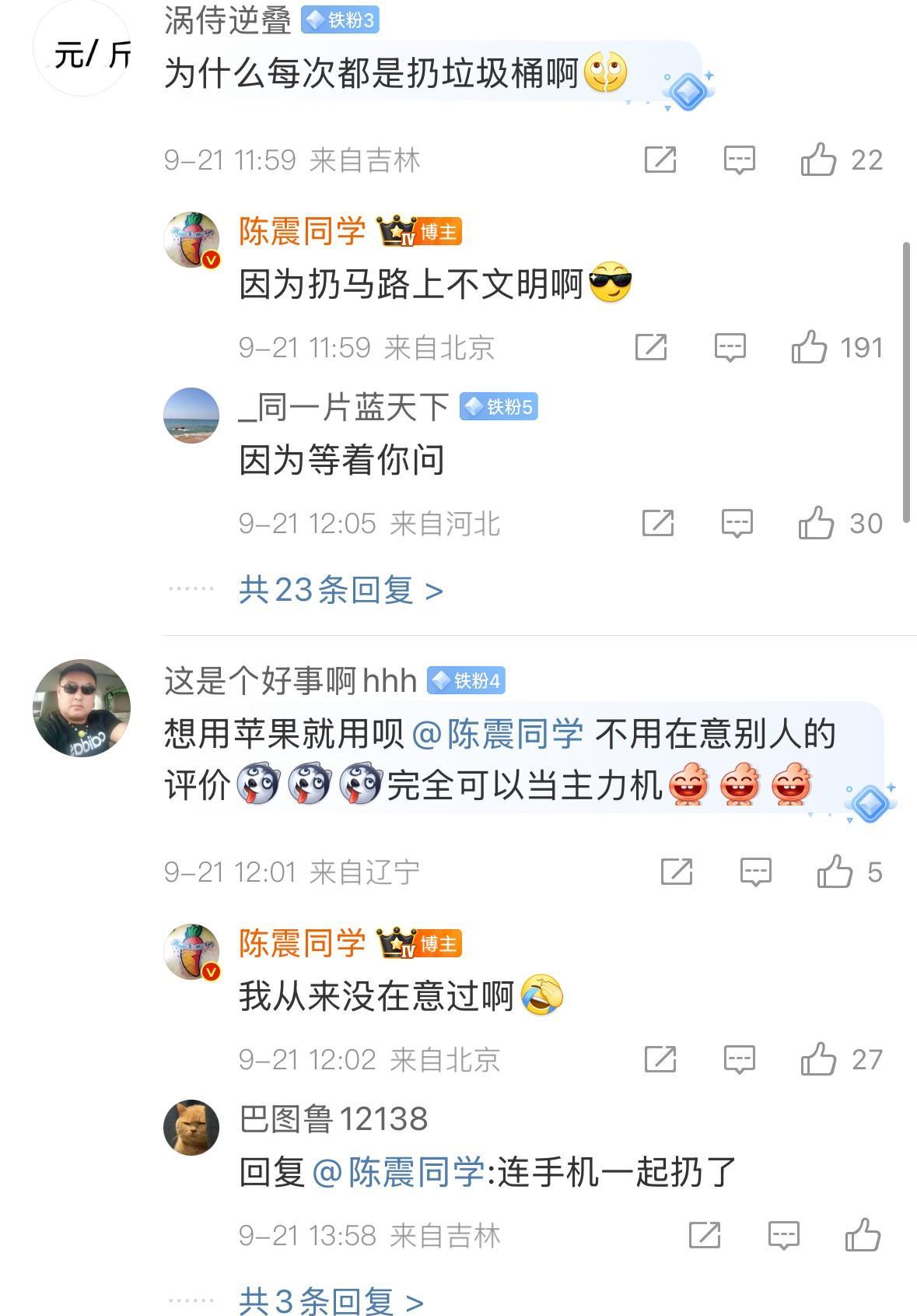 陈震一言不发拆封iPhone 17 Pro,并直接把包装盒扔垃圾桶里,被网友质疑对待苹果冷暴力。据悉,这并不是陈震第一次这么干了,去年的iPhone 16也是直接拆完把包装盒扔垃圾桶里,全程一言不发,这你受的了吗? 对此,陈震回应表示,主要是“因为扔马路上不文明”……看不懂这个行为的理由在哪里?反正大部分人没有拆封直接扔包装盒的喜好吧。[捂脸][捂脸][捂脸]