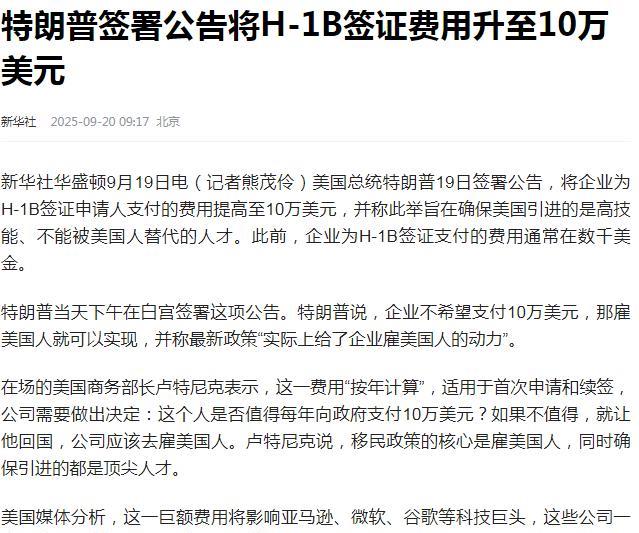 签署行政令将H-1B的年费提升至10万美元,特朗普为啥要这么干?说穿了就是拆墙游戏,系统性拆解民主党经营数十年的利益高墙,再将砖石搬运到共和党的地盘上重建。 9月19日签署公告后,特朗普声称,此举是为了确保美国引进的是高技能、不能被美国人替代的人才。问题是H-1B签证在美国一年都挣不到10万美元,拿啥支付嘛!“如果企业不想支付10万美元,那就雇佣美国人。”新政策将于9月21日凌晨生效。 美商务部长卢特尼克则强调:“如果你要培训某个人,那就去培训那些从我们高校毕业的美国年轻人。去培训美国人,别再引进外国人来抢走我们的工作了。” H-1B签证是美国为高技能外国专业人才设立的一类临时工作签证,推出于1990年,最初期限三年,最多可延长至六年。持证者大多从事计算机相关工作,其次是建筑、工程和测量。目前,亚马逊H-1B签证雇员数高达1.3万,苹果6500多名、谷歌5300多名…… 现行签证费用通常不超过5000美元,几乎所有签证费用均由雇主支付。该项目每年通过抽签方式发放8.5万个签证,有效期为六年,马斯克就是凭这玩意从南非润美国的。 2024年,72%的H-1B签证发给了印度人,中国占比12%,菲律宾、加拿大和韩国公民总共占比1%。获批者大约70%为男性,平均年龄33岁。与此同时,印度人占比美国绿卡申请积压量已高达82%。 其实,美国高科技基本是靠华裔支撑,印度裔的科研能力远远不如华裔,反而特别热衷于拉帮结派。他们既高调又张扬,对美国没有丝毫敬畏之心。遇事就咋呼,特喜欢上纲上线,干啥啥不行,辩经第一名。不仅日常批判美国文化,甚至还在美国搞印度民族主义。 拜托!你在别人家里搞民族主义,这不找死吗?前些年,美国还指望印度制衡我们,结果5.7空战之后突然顿悟,印度就是一堆扶不上墙的糊糊,骗吃骗喝,光吃饭不干活,拿了美国无数好处,一点正事没干。 更让人无法容忍的是印度人还反噬雇主,俄乌战争支持俄国,甚至派人到美国和加拿大搞暗杀。把铝合金零件当钛合金卖,搞得美国宇航员坐滩国际空间站,回不了地球,让美国丢尽了脸面。印度移民还拉帮结派钻营美国岗位,导致白人失业。美国人及其亲朋好友都被印度人诈骗过…… 所以,在美国人眼里,印度人就是天赋异禀的暴徒,其罪恶简直罄竹难书。所以,美国人极其痛恨印度人,宁要墨西哥移民,都不要印度移民。 新政策宣布后,亚马逊、微软、Meta等公司立马就向其持有H-1B雇员发送紧急通知,建议他们在21日政策生效前返回美国。以至于从印度新德里飞往纽约肯尼迪机场的机票价格从20日起急升翻倍。 有用户在社交平台X上写到:“从新德里飞往纽约的航班目前价格为4500美元。他们都急于回美国,因为他们担心新的H-1B签证规定。”在三藩市国际机场,原定回国休假的印度人登机后收到消息,立马惊慌失措,纷纷要求立即下机。 在同一场合,特朗普还宣布设立“黄金卡”签证项目。外籍人士在符合美国相关法律以及国家安全要求的前提下,可通过无附加条件的捐赠,加速程序申请移民签证。捐赠金额为个人缴纳100万美元,或由企业赞助缴纳200万美元。 其目标群体为全球净资产超3000万美元的富豪,目标是售出100万张“白金卡”,预计收入5000亿美元。截至目前,政策官网已开放注册,但具体发放时间未定。商务部长卢特尼克称已有7万人注册,但实际申请量可能因条款模糊而低于预期。 因为很多人担心一旦润过去,就会从羊毛变成砧板上的鱼肉。其实,这种金钱换身份的玩法,就是将移民权商品化。本质是重新定义“美国梦”,将其从“机会平等”转向“资本特权”。说穿了就是趁着还在台上,尽量多捞钱。 现在,特朗普政府就像一台高效运转的政治粉碎机,试图在四年内将民主党经营数十年的利益高墙全部碾碎,再从中筛出对共和党有利的金砂。其逻辑就是:制造危机→瓦解旧秩序→逼迫站队→重建依附性网络。 比如H-1B签证,为了压制民主党铁票仓加州硅谷的科技企业,特朗普政府把H-1B签证的拒签率从拜登时期的6%提升到34%。目的就是迫使苹果、谷歌等民主党金主企业增加外包,间接利好与共和党关联的外包公司。 当政治退化为分赃游戏,制度便会沦为猎食者的盛宴。这种拆墙术主要遵循三重法则:制造真空、重构依附和利益置换。通过制度性暴力瓦解旧秩序,在废墟中重建共和党主导的利益网络。 这种策略虽然会加剧社会分裂,但符合特朗普“交易的艺术”。以党争为工具,将国家机器转化为党派利益再分配平台,最终实现特朗普集团及其背后金主的双赢。这并非治国,而是政治复仇,是饥饿游戏!