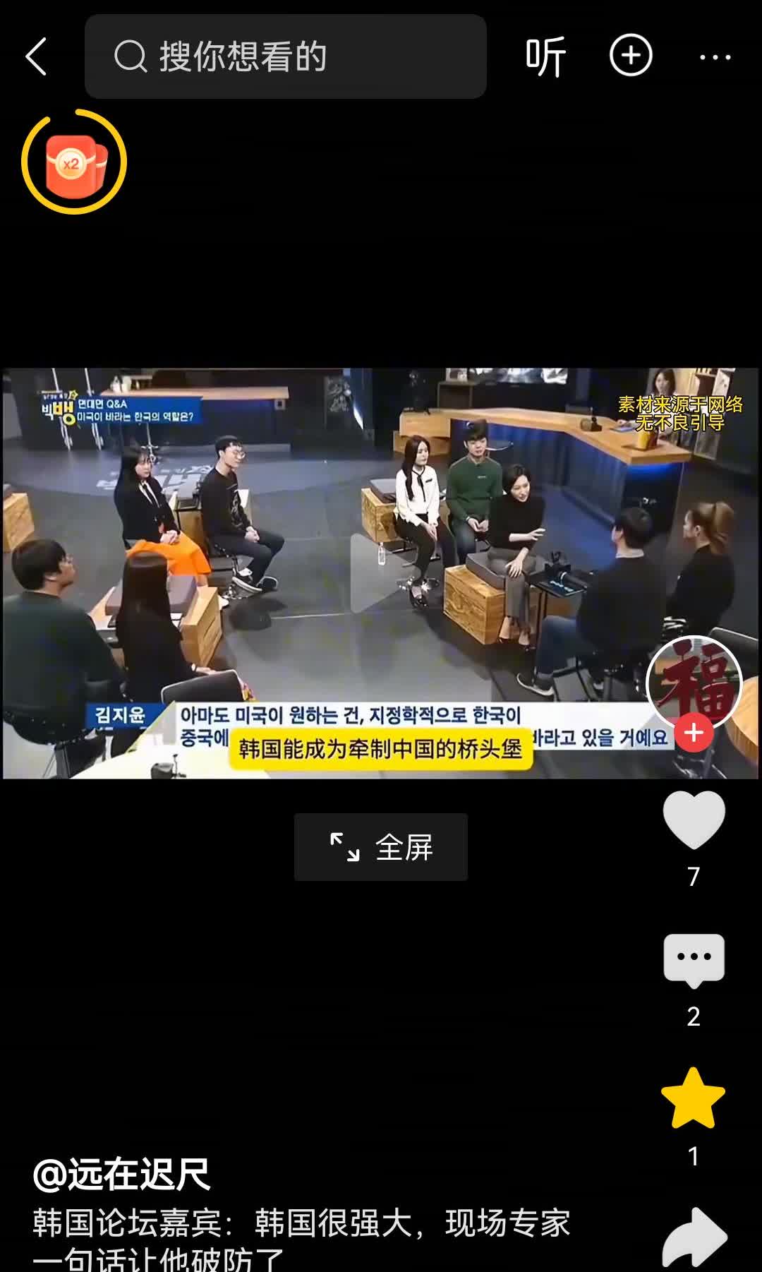 这次,自大的韩国人竟被自己人“打脸”了。 在一档韩国节目中,一位韩国男士自信满满地表示“韩国这么强大,应该在世界上扮演更重要的角色”。结果女嘉宾毫不客气地回怼:“我们总是太以自我为中心,可遗憾的是,我们根本算不上强国,只不过是被美国用来牵制中国的‘桥头堡’罢了。” 难得韩国也有这么清醒的声音!可惜大多数韩国人还沉浸在“宇宙第一”的幻觉里,尤其是他们在外网上的那些评论,常常看得人又气又无语。对此大家怎么看?