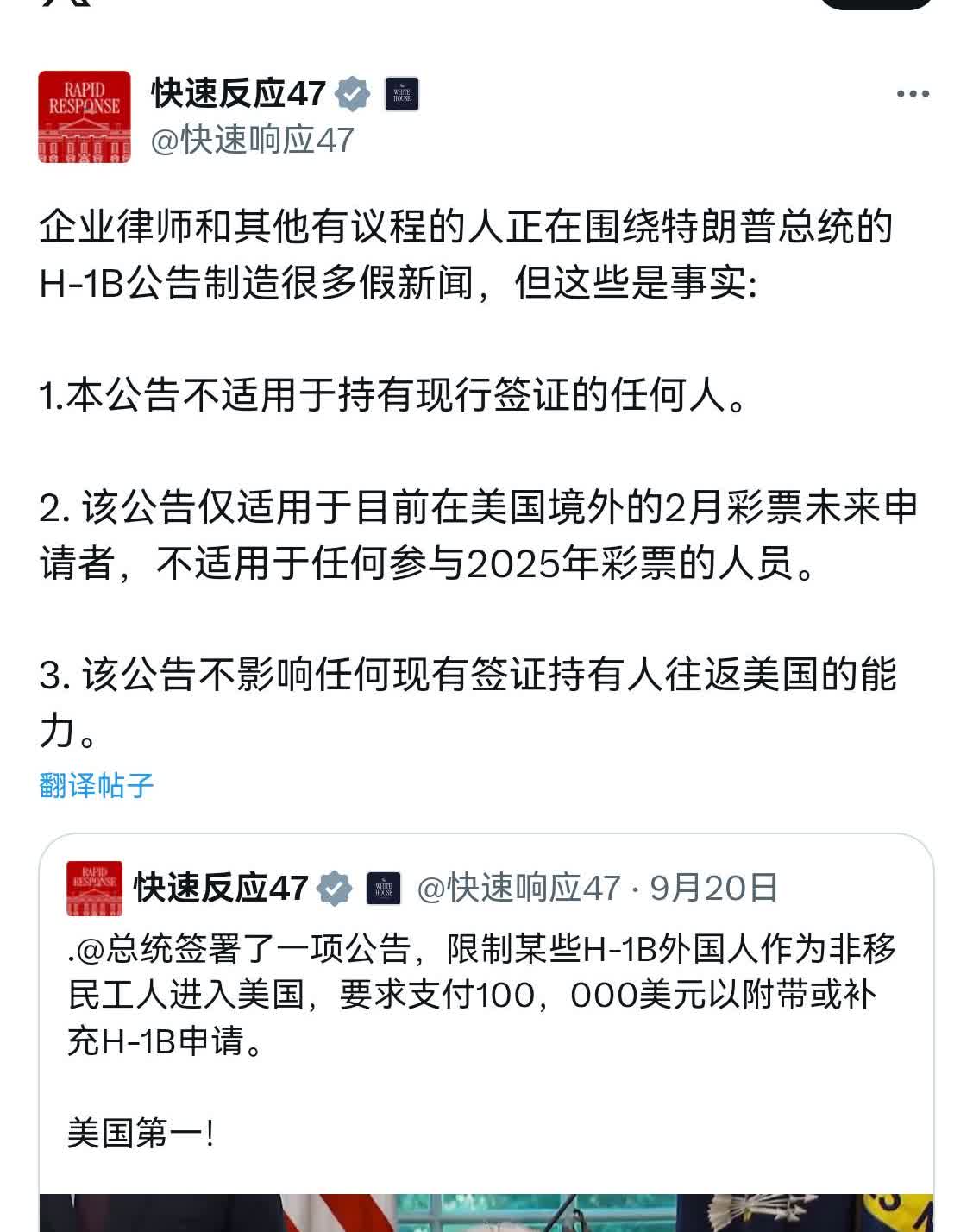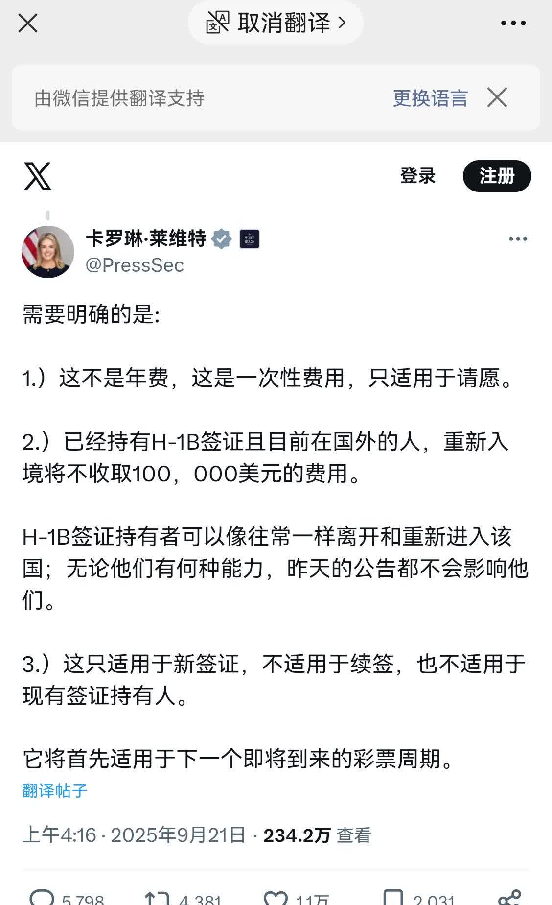 WH对H1-B收费的政策给终于给出解释。之前,让各大公司HR虚惊一场,让不在米国的牛马们成惊弓之鸟,让航空公司含泪小赚。朋友昨天凌晨回国,飞机刚着陆便收到HR的邮件,立即买晚上回米国的机票,花了一万多的机票,路上熬了50小时,呆家2小时。[捂脸] WH今天的推特: 1.公告不适用于持有有效签证的人。 2.该公告仅适用于2月抽签中目前身处美国境外的未来申请人,不适用于任何曾参与2025年抽签的人。 3.这项公告不会影响任何现有签证持有者前往/离开美国的能力。 卡罗琳今天的推特: 1.)这不是年费。这是一次性费用,仅适用于申请 2.)已经持有H-1B签证并且目前在境外的人将不会被收取10万美元的重新入境费用。 H-1B签证持有者可以像平常一样自由进出该国;他们拥有这样做的能力并不会受到昨日公告的影响。 3.)这只适用于新签证,不包括续签和现有签证持有人。 它将首先在下一个即将到来的抽签周期中适用。