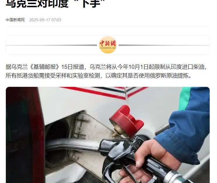 乌克兰这回是正式发话了!连他们安全局都直接下了命令:从10月1号开始,凡是从印度运柴油过来的船,每一艘都得停下来接受检查。这就让人纳闷了,印度到底干了啥事儿啊?乌克兰为啥偏偏要这么针对印度的柴油呢? 乌克兰现在特无奈,自己炼油的地方被打坏了,柴油全得靠进口,只能找印度买。 可问题是,印度的柴油好多是用俄油炼的,等于乌克兰一边跟俄罗斯打仗,一边间接给人家送钱,这事儿搁谁身上都别扭。 印度也精明,现在买俄油买得特别多,以前才买2%,现在快到40%了。 俄油便宜啊,印度买回来炼完,再高价卖给乌克兰,中间能赚不少差价。 这种事儿,其实欧盟那边也有,表面说少买俄油,暗地里也从印度进柴油。 乌克兰没办法,只能说从10月1号开始,所有印度来的柴油船都得化验,查是不是俄油炼的。 可这招根本不顶用,去年对希腊的柴油也这么查过,油商混着不同来源的油卖,根本查不准。 再说了,乌克兰要是真不让印度的柴油进,前线的车都开不动,仗就没法打了,所以这查也就是走个过场。 说到底,这哪儿是查柴油啊?就是小国在大国博弈里的难。 俄罗斯想通过印度继续卖油,印度想赚钱,乌克兰想保住立场又不能断油,三方扯着。 本质上,都是能源掐着脖子的无奈——弱小的一方,就算知道不对劲,也没太多选择。 到最后才明白,燃料里藏的不是油,是小国在大环境里的身不由己。 想硬气,可现实不允许;想妥协,心里又不甘,只能在这种矛盾里凑活,盼着能早点喘口气。