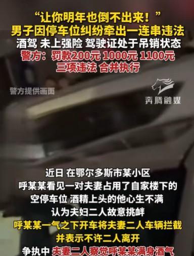 内蒙古鄂尔多斯,男子看到自己楼下的车位被一对夫妻给占了,他上去理论,这对夫妻有些不情愿地开车走,男子觉得这对夫妻在挑衅他,他一气之下开车将这对夫妻拦截,还说道:“让你明年也倒不出来!”结果这对夫妻报了警,男子反而被罚款了2300元。 据奔腾融媒,9月21日报道,当时这名男子回到自己楼下,远远的就看到了自己楼下的车位,被一对夫妻开车占了。 他可生气了,这可是他楼下的车位,这是私人车位,只要这对夫妻仔细点看,就知道这个车位是不能停车的,可是他们若无旁人地把他的车位给占了,男子难以释怀。 他走了过来,开口就跟这对夫妻说:“你们把我的车位给占了!” 这对夫妻一听,没想到车位主人这么快就找上来了,他们本来将车停一会儿就把车开走的。现在看来,他们停不了了,只好一脸无奈地将把车开出来。 结果男子看到那对夫妻的表情,很不情愿地去开车一样,他就觉得这对夫妻目中无人,在挑衅他。 这本来他们占了男子的车位,男子觉得不对的人是他们,他们应该道个歉,这才是做错事情的态度,可这对夫妻,不道歉,上车就想走,真的是太不会做人了。 他们正好遇到男子,是喝了酒的,男子此时也酒精上头,他一气之下,就开着自己的车拦截了这对夫妻。 他大声地说道:“我让你明年也倒不出来!” 这对夫妻只好下车,他们要跟男子理论,因为他们要开车出来,就已经不打算占男子的车位了,男子不应该如此咄咄逼人。 他们在和男子的理论中,他们发现男子说话有很大的冲劲,他们也闻到了男子那一身的酒气,他们看到男子在开车,很快他们想到了什么,他们也看不惯嚣张的男子,于是就报了警。 结果这一报警,他们发现的男子一连串的违法行为。 民警过来之后,他们对男子进行呼气式酒精检测,结果男子是醉酒驾车。 除此之外,他们还发现男子没有上强险,驾照也处于被吊销的状态中。 于是男子受到了处罚,酒驾被罚款200元,没有上强险被罚款1100元,驾照处于吊销的状态中,被罚款1000元,男子被罚款了2300元。 因为一个车位纠纷,男子却被罚款了2300元,估计男子酒醒之后,肠子都悔青了。 其实如果男子是清醒的,如果他也意识到这对夫妻并非有意要占他的车位,他们看到车位主人来了,也马上让出车位,男子如果没有追究这个事情,可能他也不需要被罚款2300元。 那么如何认定这件事情呢? 1、关于醉驾,这肯定是不行的。 《道路交通安全法》第91条规定:醉酒驾驶机动车的,由公安机关交通管理部门约束至酒醒,吊销机动车驾驶证,依法追究刑事责任;五年内不得重新取得机动车驾驶证。 醉酒驾驶很危险,是危险驾驶,不但不利于自己,还有可能会危害到别人。 2、 没有买强制保险,一旦发生交通事故会很麻烦。 《机动车交通事故责任强制保险条例》第38条规定: 机动车所有人、管理人未按照规定投保机动车交通事故责任强制保险的,由公安机关交通管理部门扣留机动车,通知机动车所有人、管理人依照规定投保,处依照规定投保最低责任限额应缴纳的保险费的2倍罚款。 如果没有上强险,一旦发生交通事故,男子可能拿不出这么多钱来赔给他人,有可能会导致自己或对方的家庭困难。 3、 驾照处于被吊销状态是不可以开车的。 《道路交通安全法》第99条规定:有被吊销或者机动车驾驶证被暂扣期间驾驶机动车的的,由公安机关交通管理部门处二百元以上二千元以下罚款。 男子处于驾照被吊销的状态就属于无证驾驶。 因此男子被三项合并处罚,这也是合法合规的。 那么,你对男子的事情有何看法呢?素材来自奔腾融媒。