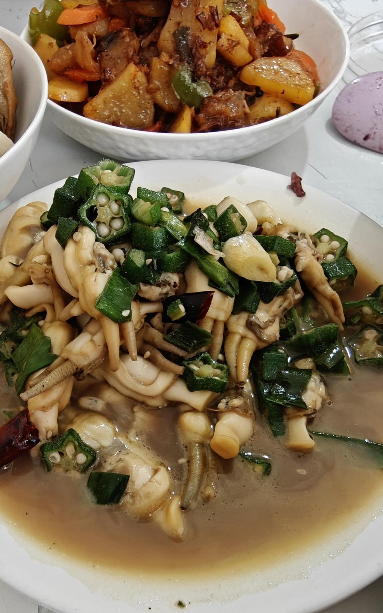 那天刷视频,无意看到有人用秋葵炒蛏子。 今天一早去早市和我家老张买了一斤蛏子23