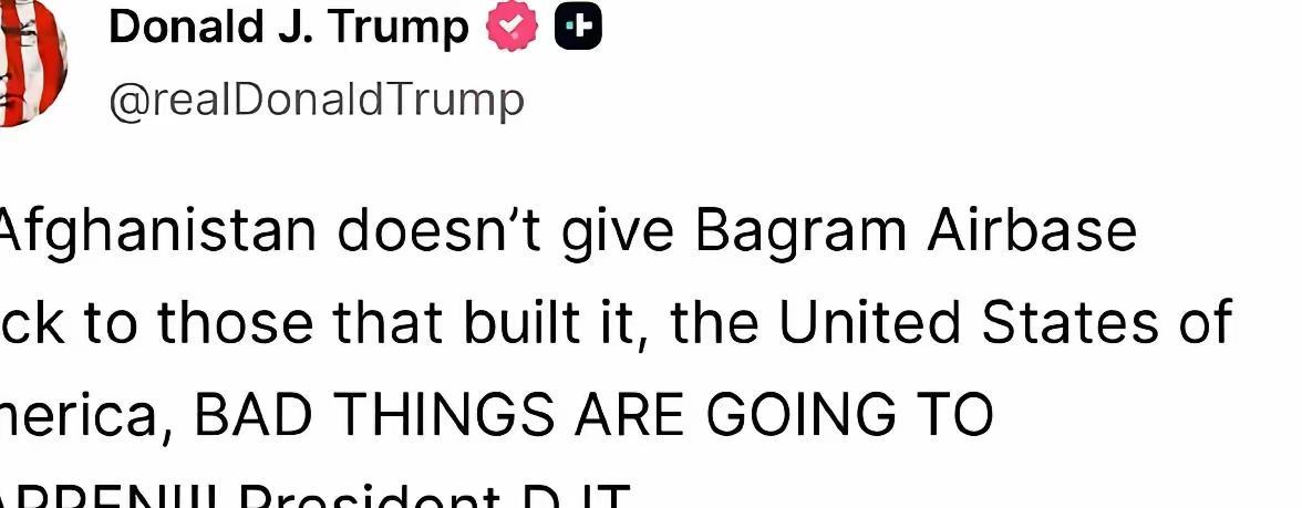 阿富汗塔利班好样的! 今天,阿塔国防部长穆贾希德,正式对特朗普要明抢阿富汗巴格拉姆空军基地的言论,给予了嘲笑。 他说:如果你们想占领巴格拉姆空军基地,那我们就再和你们战斗二十年。(图一,阿富汗塔利班政府) 9月21号,特朗普在社交平台上发推,说如果阿富汗不把巴格拉姆空军基地,归还给它的建造者一一美利坚,将会有坏的事情发生。(图二,特朗普推文) 塔利班这次回应可不是打嘴炮。上一次阿富汗战争,从2001年开始,一打就是二十年,直到2021年美军从巴格拉姆空军基地撤走最后一名大兵,才算结束。(图三,最后一名美国大兵2021年撤离阿富汗) 现在老美还敢再次下场吗?