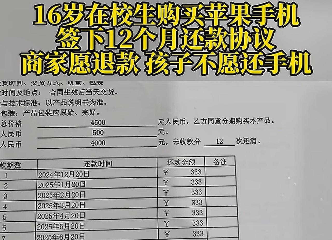 重庆,16岁男生瞒着母亲在一家公司购买了一部苹果手机,总价4500元,并与该公司