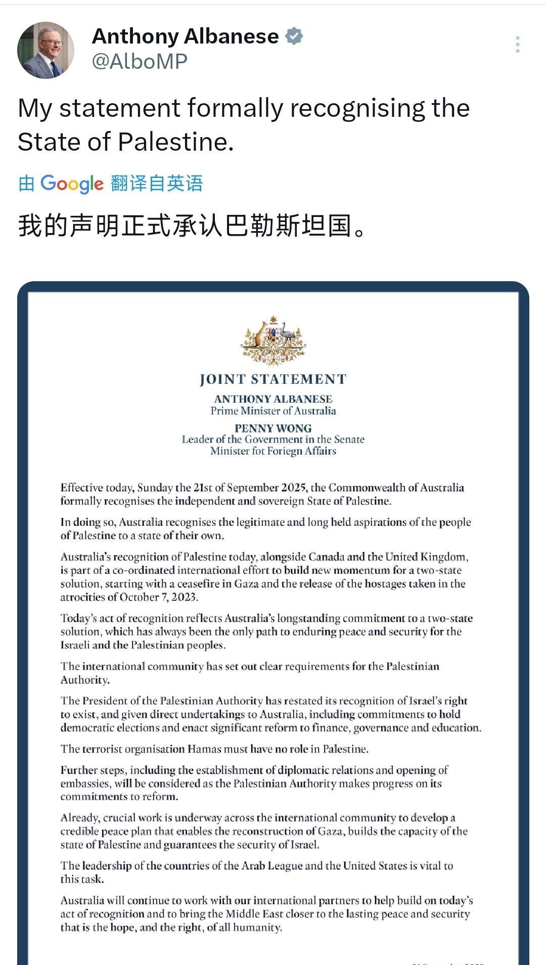 今晚(北京时间9月21日晚),对饱经战火的巴勒斯坦人民而言,这是具有历史意义的时刻。加拿大总理卡尼、英国首相斯塔默、澳大利亚总理阿尔巴尼斯相继发布声明,宣布三国正式承认巴勒斯坦国。法国总统马克龙也明确表示,将于9月22日在联合国演讲中正式承认巴勒斯坦国,并强调此举是落实“两国方案”、推动地区和平的关键一步。 多国承认巴勒斯坦国,是国际社会对“两国方案”的有力支持,给深陷战火的巴勒斯坦人民带来希望。这既是地缘政治博弈下重塑话语权的举措,也反映出对结束冲突的迫切需求。但落实“两国方案”依然挑战重重,以色列拒绝承认、美国偏袒纵容以色列、哈马斯去武装化进程缓慢。国际社会需以实际行动推动和谈与重建,而非仅停留表态,如此巴勒斯坦“建国梦”才有实现的可能性。