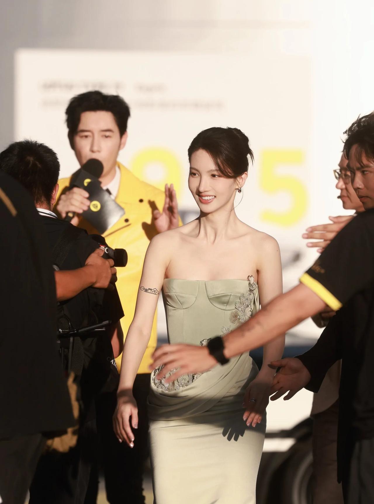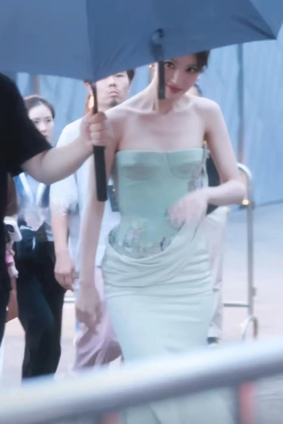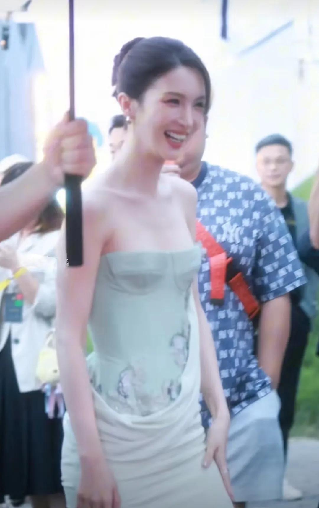 不知道金晨是大胆还是虎, 穿这种抹胸裙, 居然没穿防走光的裸色内衬! 就不怕走着
