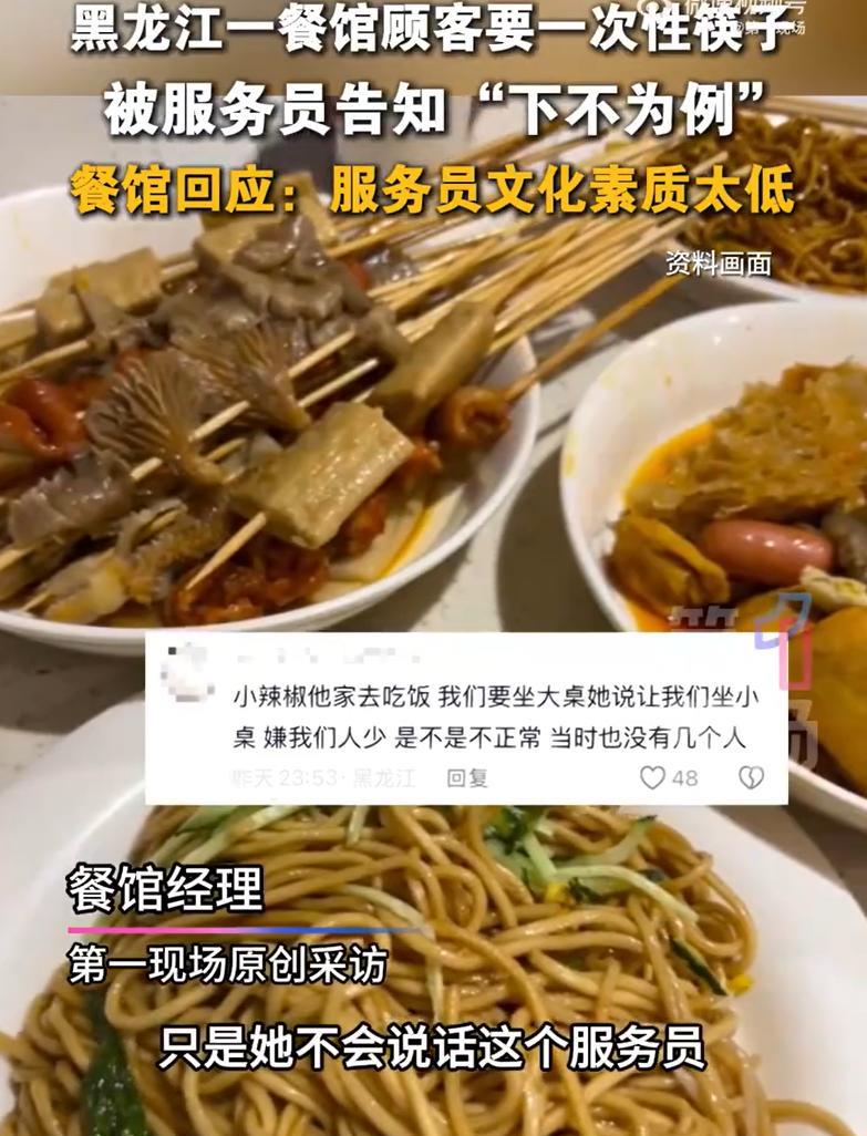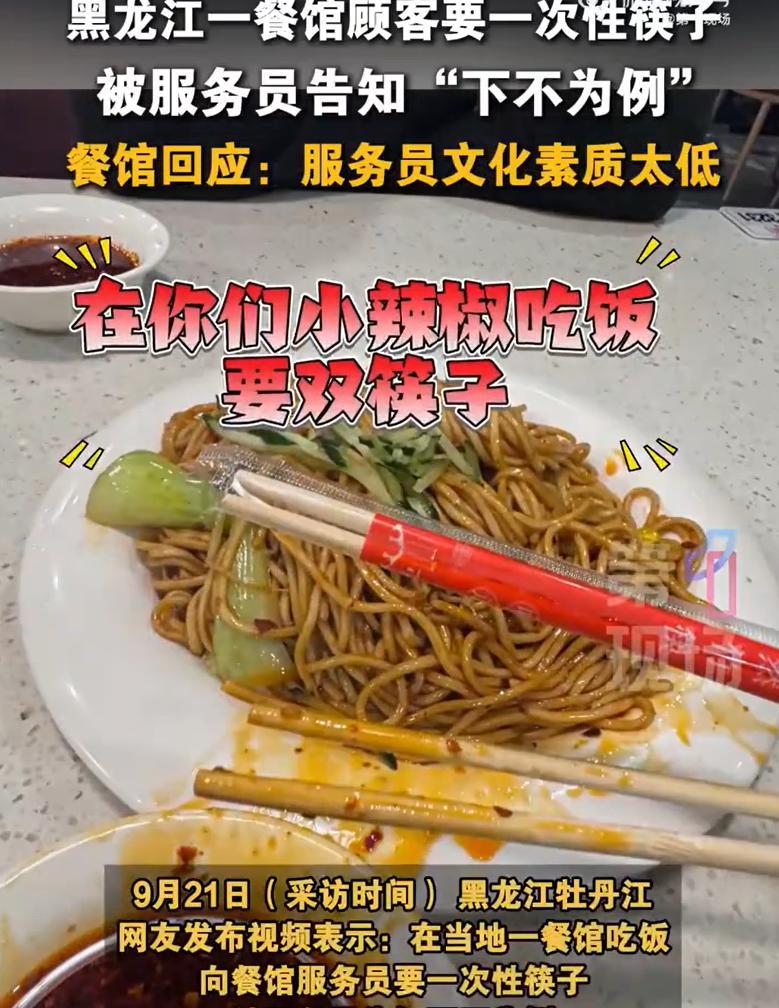 “来消费还要看你脸色?”黑龙江,女子和家人去餐厅吃饭,不料,她和服务员提出想要一双一次性筷子,对方很不情愿的拿了一双扔在桌子上,嘴里还甩出一句“下不为例”,女子也是当场被气坏,店家回应:店员不会说话 当晚,金女士和丈夫坐下来点餐,发现桌上摆的筷子是“精装版”——除了筷子本身,还附带纸巾和湿巾,但要收费,一元一双。金女士平时习惯自带湿巾,觉得这钱花得没必要,就问服务员能不能换一种免费的一次性筷子 服务员一听,不太乐意,说那种简易筷子也要收一元。金女士觉得奇怪,怀疑对方是新来的不清楚规定,就请她再去问问经理 没想到,服务员转身从另一个房间拿了两双简易筷子过来,直接往桌上一摔,甩下一句冷冰冰的“下不为例”,扭头就走 这一摔,把金女士给摔懵了。她说,当时心里特别不舒服——明明只是合理要求,怎么还像做错事一样被“警告”? 她放下筷子,直接去前台讨个说法。店里的工作人员解释,他们店有三种筷子:一种是免费的消毒筷,一种是带湿巾纸巾的收费精装筷,还有一种就是金女士要的那种简易包装筷。但这种简易筷,通常只免费提供给小朋友,大人要用原则上得收一元。服务员之所以说“下不为例”,是怕大家都来换免费筷子,对收了费的顾客不公平 不过前台也承认,服务员确实“不会说话”,态度有问题,服务不到位 说实话,这事儿不大,但确实让人心里不舒服,因为我们都可能遇到,不是非要争一双免费的筷子,而是不愿看人脸色吃饭 开门做生意,服务员某种意义上就是店铺的“脸面”。一句话能让人暖心,也能让人瞬间下头。金女士的要求未必符合店规,但沟通的方式有很多种。一句“不好意思,这种筷子我们一般只免费提供给小孩,您看需不需要用消毒筷?”或许就能化解尴尬,何必非用“摔筷子+警告”的方式处理? 顾客提出需求,不一定是想“薅羊毛”,可能只是习惯不同。这时候,耐心解释比强硬拒绝更重要,礼貌沟通比冷言冷语更管用