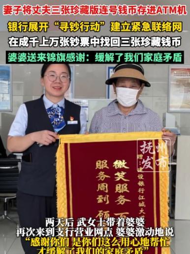 “害人又害己!”湖北武汉,一女子把丈夫钱包里的4000元现金存入银行,没想到回家后,丈夫发现妻子不慎将他保存多年的珍藏版连号钱币也存进去了,两人顿时发生了争吵,女子哭着求助银行主管,让其帮忙从成千上万张钞票中找回3张珍藏钱币,网友:实力不是一般的硬啊! 武汉建行江城大道支行的柜台里,曾放着两张特殊的纸:一张是武女士的存款凭证,另一张是她后来送来的锦旗。 前者藏着一场家庭争吵的源头,后者则记录着一场跨越几天的温暖和解——而这一切,都围绕着三张被误存的连号币展开。 最先出现的是那张存款凭证。 9月2日下午,武女士攥着它走出银行,纸面印着“存款金额4000元”“自助设备编号XXX”的字样,她当时还笑着把凭证折好放进包里,觉得这是“为家里省心”的证明。 那天她收拾卧室时,在衣柜角落翻出丈夫的黑色钱包,看到里面的4000元现金,没多想就去了银行。 她不知道,钱包内侧拉链夹层里,用软布包着丈夫珍藏十年的连号“豹子币”,尾号“666”“777”“888”,是丈夫创业初期拿第一笔盈利换的“幸运符”,这些年换钱包都特意留着夹层放它,却从没跟武女士说清重要性。 这张凭证的“杀伤力”,在当天晚上就显了出来。 丈夫下班回家,习惯性摸钱包找那三张连号币,翻到空钱包时瞬间慌了。 得知钱被存进银行,他急得声音发颤:“那三张连号币呢?我存了十年!” 武女士愣了:“什么连号币?我全存了啊!” “你怎么不跟我商量?那不是普通钱!” 争吵声越来越大,最后丈夫摔门进书房,武女士握着那张存款凭证掉眼泪——她从没见过丈夫这么激动,也才意识到自己闯了祸。 三天后,这张存款凭证成了“救命符”。 9月3日中午,武女士盯着凭证上的银行电话,犹豫半天还是拨了过去。 接电话的营运主管徐静,听着她带着哭腔的讲述,先安抚情绪,再对着凭证记下存款时间、机器编号,承诺会找。 挂了电话,徐静拿着记录单忙了一下午:调交易记录锁定机器,联系清机团队优先处理,给二级行、省分行打了39通协调电话。 清机人员打开存款机时,里面堆着近万元现金,他们戴着手套逐张翻,用放大镜辨模糊编号,傍晚终于找到那三张连号币。 9月5日,武女士再到银行时,手里的凭证换成了期待。 徐静把连号币递过来,她赶紧转给丈夫,那个平时少言寡语的男人红了眼,反复说“谢谢”。 武女士拉着他的手说:“以后你有宝贝,可得跟我说。” 丈夫点头:“是我没讲明白。” 这场因凭证引发的风波,终于有了转机。 又过了两天,银行里多了第二张特殊的纸——武女士和婆婆送来的锦旗,上面绣着“服务周到暖人心,尽职尽责解民忧”。 徐静看着锦旗,又想起那张存款凭证,忽然觉得,这两张纸连起来,就是一个关于沟通与善意的故事。 有网友表示,作为收藏爱好者太懂这丈夫的急了!尾号 666、777、888 的豹子币,十年前凑齐得多难,而且还藏着创业回忆,丢了比丢钱还心疼! 更多网友为银行点赞:现在找银行办点特殊事多不容易,徐静主管打 39 通电话协调,清机人员还一张张翻现金,这态度真的绝了! 还有人总结道:“一张存款凭证引争吵,一面锦旗又和解,说到底还是‘沟通’俩字。 家里有珍藏品别闷着,多跟家人说说,遇到事也能少点误会,多份理解。” 其实生活里很多事都这样,一张纸可能藏着麻烦,但只要有人愿意多份耐心,有人愿意多句坦诚,麻烦就能变成温暖的回忆。 就像武汉这对夫妻,还有那两张特殊的纸,最后都成了笑着说起的故事。 如果各位看官老爷们已经选择阅读了此文,麻烦您点一下关注,既方便您进行讨论和分享,又能给带来不一样的参与感,感谢各位看官老爷们的支持! #秋日生活打卡季#