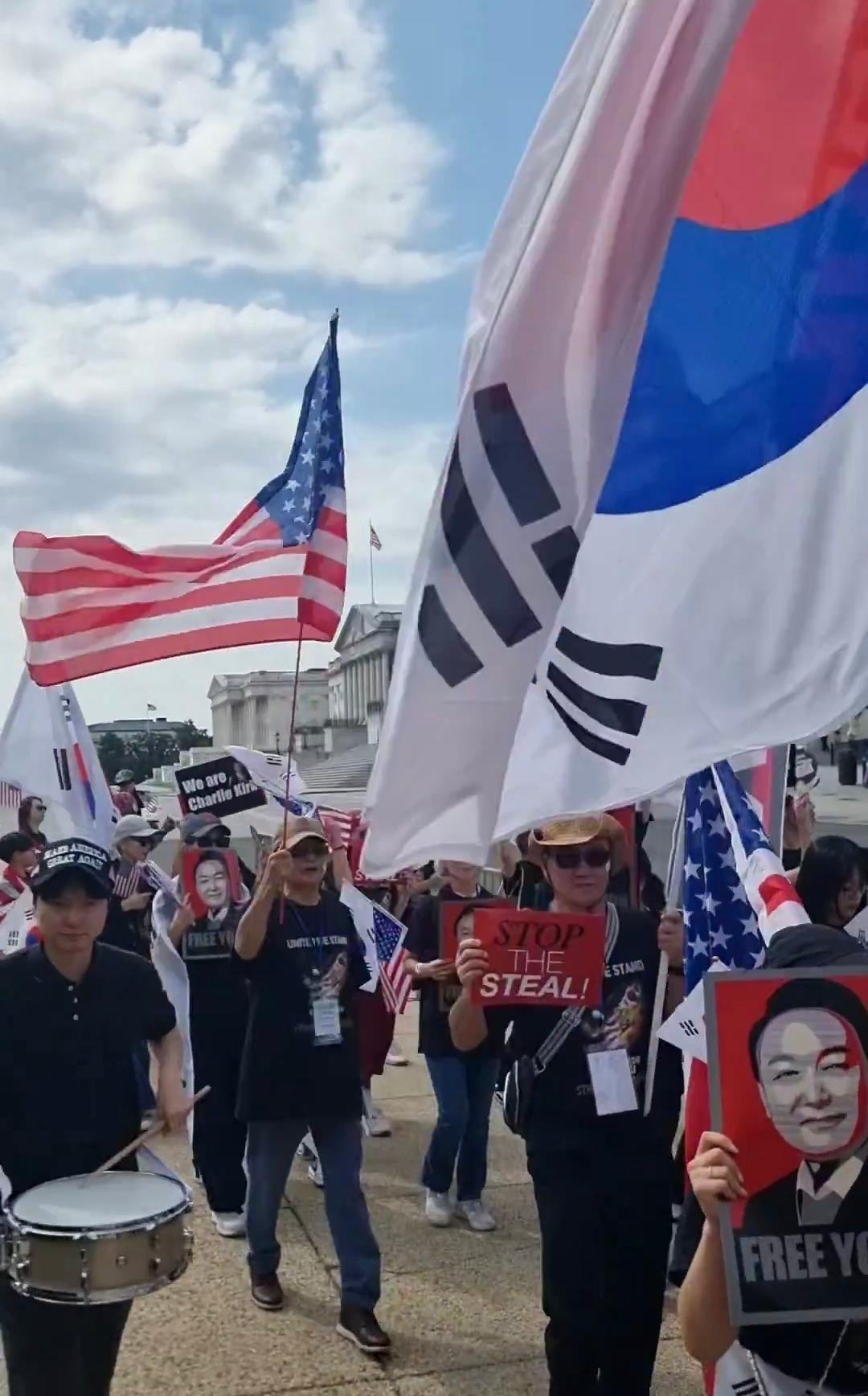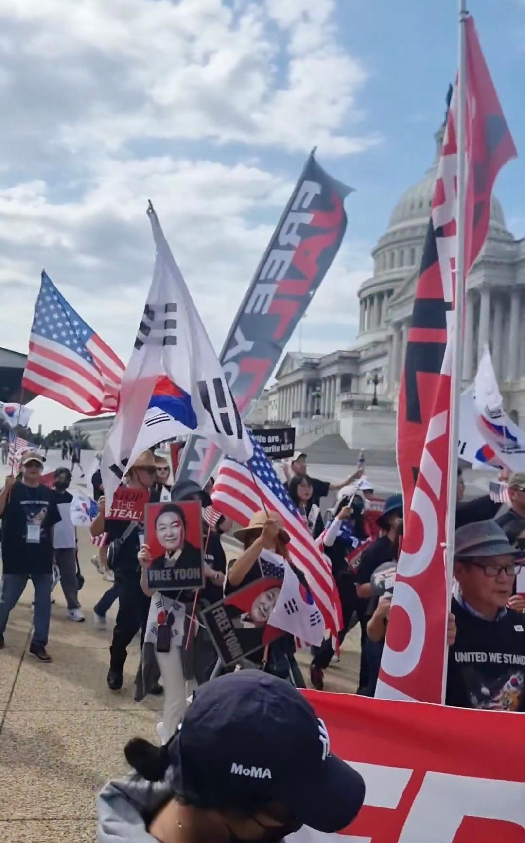 当地时间9月20日,一群支持尹锡悦的韩裔美国人(或韩国人)在美国国会大厦前游行,