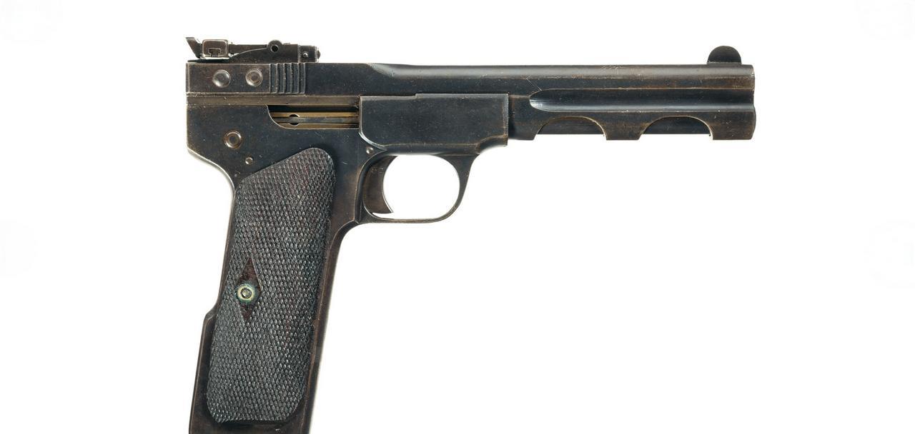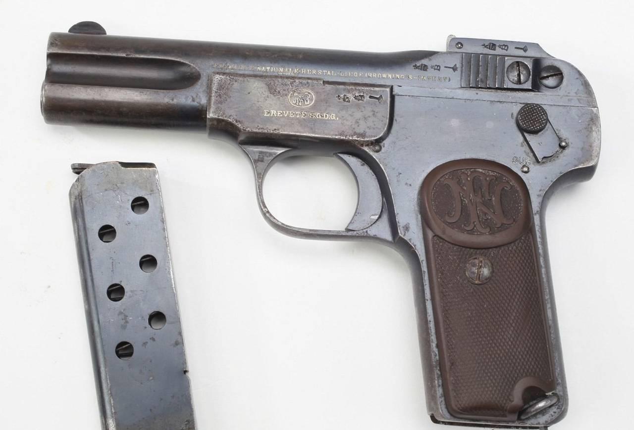 [呲牙] 旧中国枪匠的作品(1)—— 图1~2这支手枪是旧中国某个不知名枪匠所仿造FN 1900型(参见图3)的独特半自动手枪,特色是:除尺寸显著增大外,该枪还采用带散热孔的套筒、弧形表尺以及可加装枪托的背带槽(枪托应该已经遗失)。 除表尺刻度数值及套筒、底把、照门座、扳机等部件的匹配序列号外,全枪无任何厂标,握柄采用硬木贴片,刻有棋盘格纹。 目前也有一种说法:该枪可能仿自柯尔特“森林人”手枪(参见图4)。
