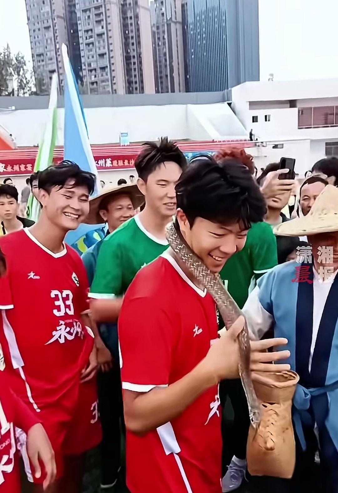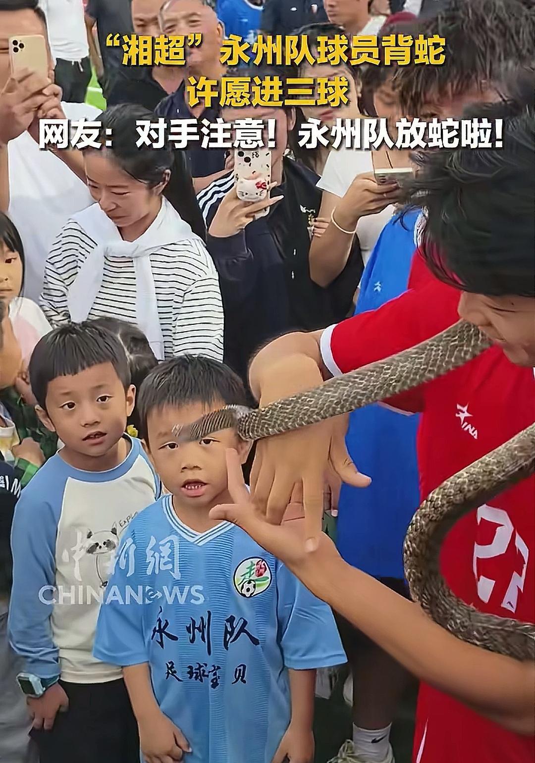湘超联赛的永州队确实厉害,今晚主场对阵湘潭队,直接疯狂进了湘潭队三个球,最终3:0大胜湘潭队。 比赛之前有养蛇的永州球迷带着蛇到比赛场地支援永州队员,当时永州队球员还把蛇挂在脖子上玩耍,完全一点都怕,从这一点看来永州队球员确实是很猛。 感觉永州队在14个湘超城市队中技战术能力还真的不错。
