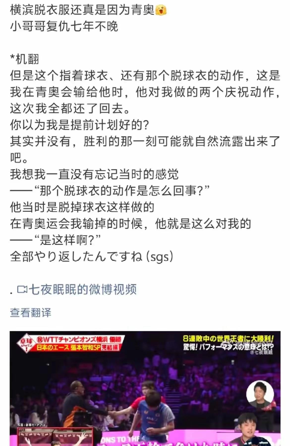 怪不得张本智和横滨夺冠后,这么疯狂,原来他在报复王楚钦! 一生一次的青奥会, 王楚钦打败张本智和夺冠, 赛后王楚钦脱衣庆祝。 张本智和隐忍了7年, 终于在横滨冠军赛 胜了王楚钦, 他也做出相同的动作! 哎,这心机好重! 但是张本智和自作多情了, 横滨冠军赛就是一个商业赛, 能和青奥会相比? 说实话, 要不是冠军赛半强制, 王楚钦都懒得参加, 中国大满贯马上开始了, 看大头锤不捶你就是了!