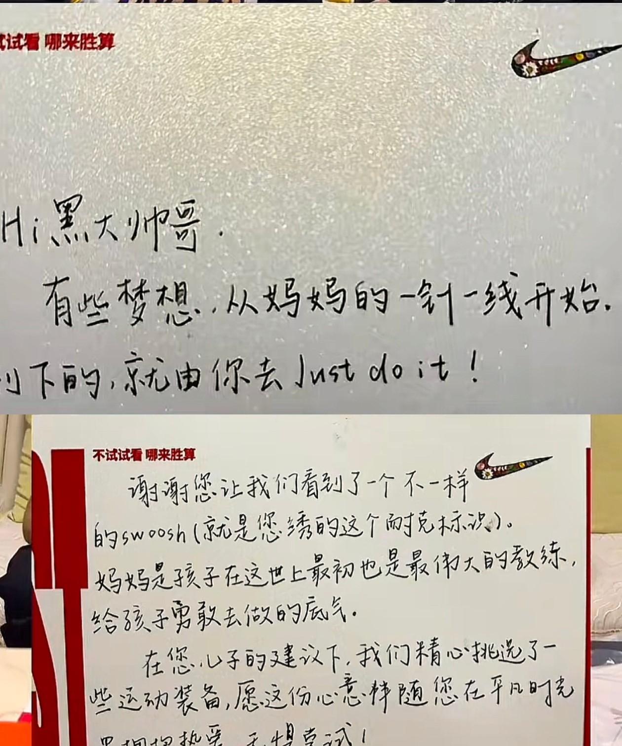 晒妈妈缝耐克标书包的男子,收到耐克官方寄来的礼物了,虽然不贵重,但看得出来很用心,也终于明白耐克为什么等了10多天才把礼物寄给男子。 给男子寄了2件NBA球星的球衣,男子说这都是他喜欢的球星,收到球衣的男子也很激动,开心的拿起了球衣合照! 而给妈妈的礼物就更用心了,全部都是定制的,有一件卫衣和一件短袖,还有一个红色的书包,上面的耐克标都是手工缝上去的,男子说这和妈妈当初缝的一模一样,以后其它人再也不会说他穿的是假耐克了。 知道男子小时候有次走丢了,妈妈为了找他,鞋都磨破了,耐克也特意送了一双跑鞋给妈妈。 最后还有2封信,一封是给男子的,鼓励他勇敢去追求梦想,另外一封给妈妈的信,感谢了妈妈让我们看到了不一样的耐克标志,称赞了这位妈妈对孩子的爱,给了孩子勇敢去做的底气! 看到这儿评论区的网友坐不住了,不是羡慕男子收到的礼物,而是羡慕男子有这样一位爱他的妈妈! 不得不说,耐克这波关怀真的做得太到位了!