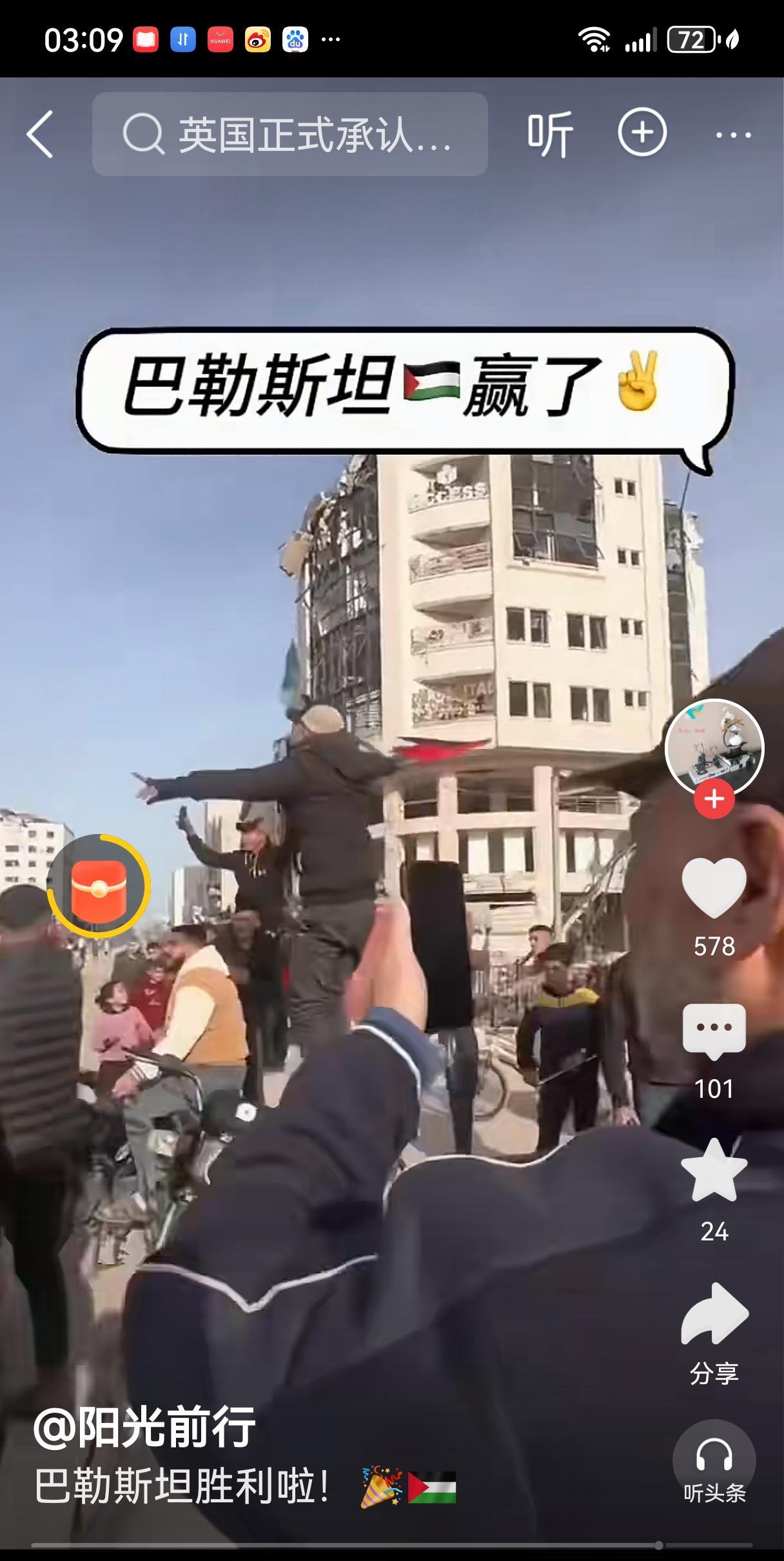 巴勒斯坦人迟到的春天,英国已承认巴勒斯坦国,明天会将有10个国家宣布承认巴勒斯坦国,巴勒斯坦人开始欢呼,他们举着国旗开着三蹦子开始狂欢,在斗争中求和平则和平,没有哈马斯的顽强战斗,就没有巴勒斯坦,约旦河西岸巴勒斯坦领土还在减少,以色列的工程车还在坼房,巴勒斯坦人还面临很艰巨的困难,这个时候狂欢还为时过早。