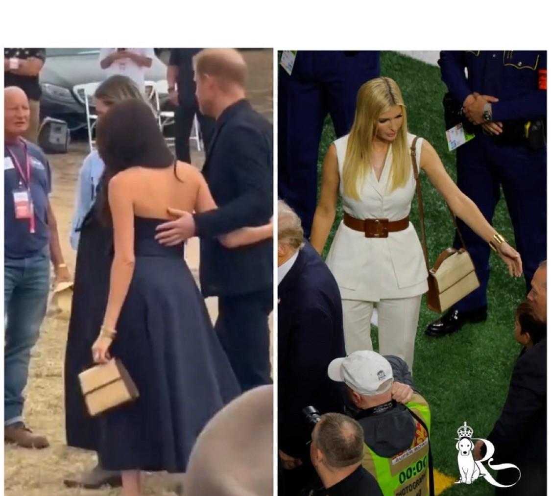 这是哈里和梅根五个多月以来首次共同公开亮相。人们看到苏塞克斯公爵和公爵夫人手挽手出席在好莱坞演员凯文·科斯特纳的海滨庄园举行的筹款活动。 当晚,梅根身着无袖午夜蓝连衣裙,搭配裸色高跟鞋。梅根短暂地陪同丈夫上台,然后拥抱他,退到一旁。 她从侧幕观看哈里王子向圣巴巴拉县消防局长马克·哈特维格颁发荣誉勋章。 晚会上,只见夫妇俩手挽手,整个过程都显得轻松愉快。 当晚出席的还有脱口秀传奇人物、苏塞克斯夫妇的重要盟友奥普拉·温弗瑞。 我们注意到,在凯特王妃染浅头发后,梅根也直接把头发染浅了。而且看起来有点胖了,从视频中发现哈里不怎么笑了。(图六和七对比) 仔细观察他们的互动方式,就会发现他们甚至没有互相看一眼。 而且,他们还带了在洛杉矶大火摆拍照片中的工作人员。两次活动他们都带了自己的摄影师。 不过,但我确实很中意梅根的手拿包,这款Hunting Season品牌的米棕相间 Raffia 草编小号手提包。数月前的超级碗活动现场,我们就曾见过这款包,当时是由光彩照人的伊万卡拎着的。(图五)