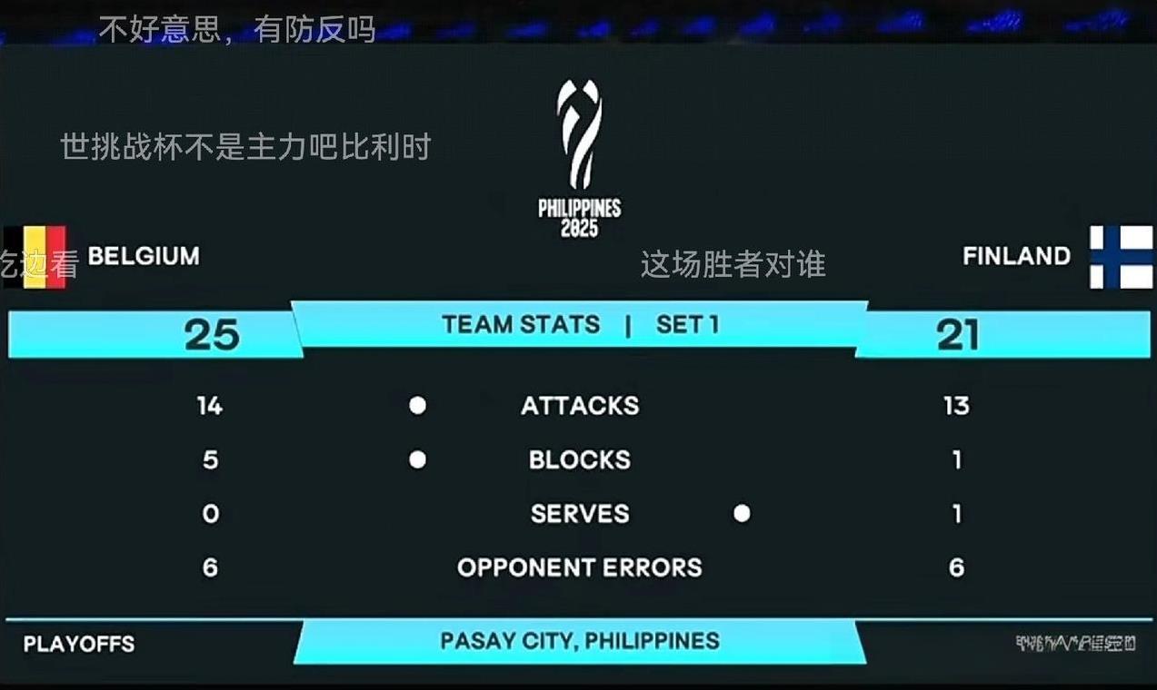 世锦赛1/8决赛第四场,第一局比利时男排后来居上,25:21战胜芬兰男排。 第一
