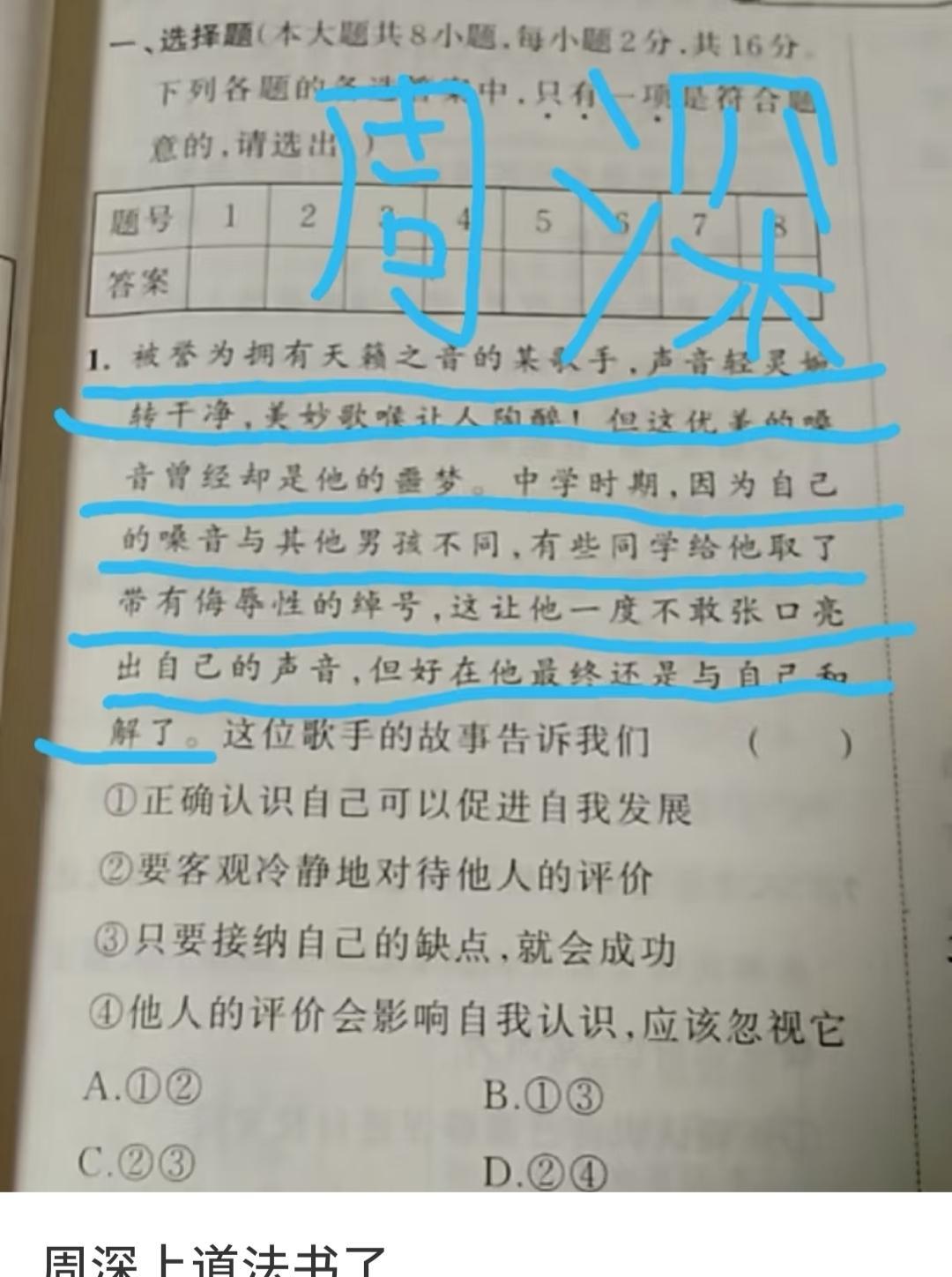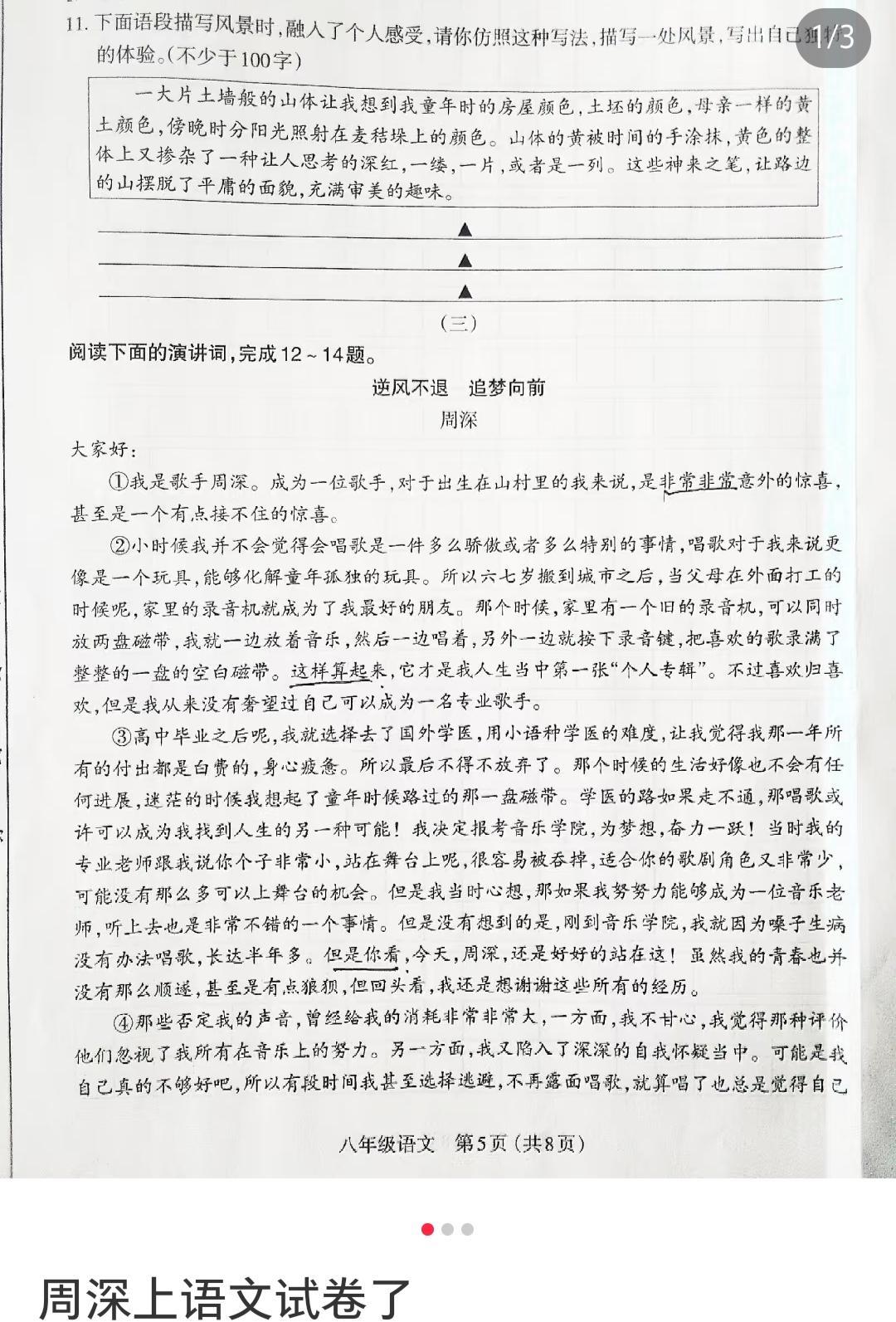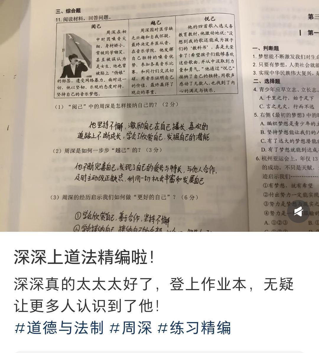又在教材上看到周深了! 苏教版初二的音乐书上看到了周深演唱的《有我》! 还有各种试卷和练习册上都可以看到周深! 从来没有这么年轻就被登上各种教材和试卷的艺术工作者, 时代青年之楷模! 周深的优秀,不只是唱歌,是全方面的优秀! 是家长和老师放心介绍给孩子,学习的榜样! #周深#
