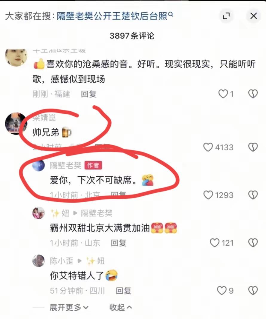 楚钦跟隔壁老樊是真爱, 他们的双向奔赴太美好! 楚钦去看老樊演唱会, 粉丝也跟着去搜老樊, “我跌跌撞撞奔向你”, 原来就是隔壁老樊的歌! 因为王楚钦, 更多的人认识了老樊, 这其中也包括梁靖崑。 楚钦四个人组队去的, 还有王CC和草莓熊, 还有肖指公子凯文, 今天看到大胖跟老樊互动, 才发现大胖也跟老樊挺熟, 大胖和大头嗓子都很好, 俩人还合唱过吉林的风, 再加上两人的亲戚关系, 很多事情也就解释清了, 毕竟有爱屋及乌的说法。 王楚钦是顶好的人, 老樊说要接他放学, 结果他先去老樊的演唱会, 听老樊唱“你的姑娘”, 楚钦举着荧光棒开心! #记录真实生活#