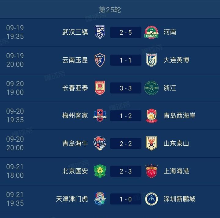 中超联赛~第25轮战报和最新积分榜! 本周末中超联赛结束了第25轮全部8场比赛,