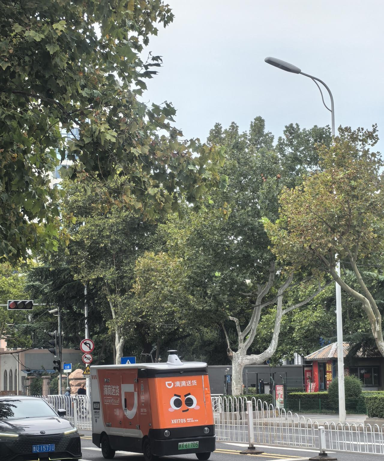 #分享城市新鲜事#不知什么时间大街上出现了并不十分灵活的自动驾驶快件运送车,这是