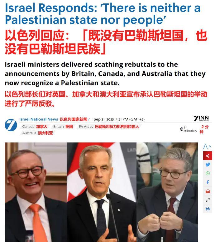 21日,加拿大、澳大利亚、英国相继宣布承认巴勒斯坦国,到于说老妹,当儿子的,那肯定是不敢的。 至于说东大,早在1988年就承认了,蓝星小伙们说说,这是不是一直就站在道义的至高点上[比心]。 小以子还挺横的,对大家纷纷承认巴勒斯坦国一事,该国的部长们(不是士兵)进行了“严厉回击”(如下图)。 咦,法国哪儿去了?平时叫唤得最响,该办事儿的时候又见不到人了[摊手]。 小马哥不会是跑去打官司去了,就为了证明媳妇是女人吧[如花]。