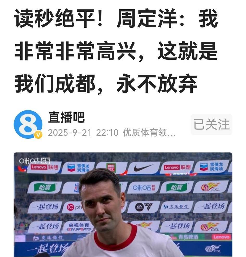 周定洋赛后接受采访,从“永不放弃”精神层面,解读了他的绝平球。但我认为这球的意义还有很多: 1.追回2小时时差,蓉城仍力压海港重新回到榜首; 2.与沪上双雄三强争霸,在平分情况下相互战绩均占优; 3.蓉城实现对BIG5不败,对海港、泰山2战全胜,对申花国安1胜1平,共积20分,创蓉城队史纪录; 4.在国安已掉队情况下,蓉城保持与上海两强的缠斗,争取有机会颠覆中超格局。 相对麻烦的事,昨天除廖荣祥小朋友很兴奋外,全队体能和竞技状态下滑了许多,最后5轮还夹着亚冠,既要还要的徐正源必须作出选择。