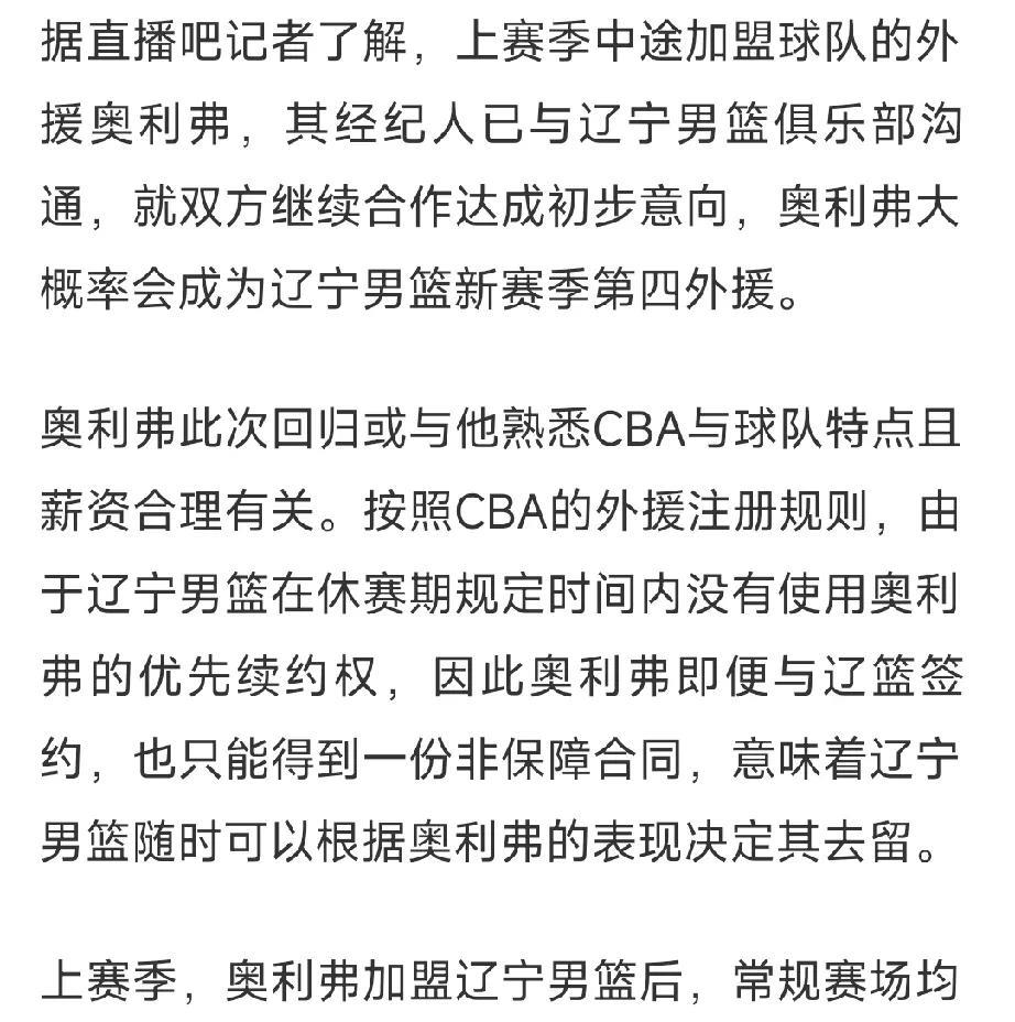 辽宁男篮第四外援基本确定,辽宁还想赌一把! 根据最新消息,辽宁男篮就第四外援已经达成初步意向,为上赛季中途加盟的奥利弗,上赛季队内阵容中缺少中锋,而奥利弗确实身高受限,导致其发挥也不尽如人意。 为什么辽宁男篮还是想要奥利弗,他在赌什么? 我想辽宁男篮看到了奥利弗强硬的一面,新赛季阵容中有莫兰德,奥利弗可以打四,毕竟还是有篮的,这样的内线双塔也是可以的,我觉得辽宁男篮是这样的,要不然辽宁男篮也会签下四号位!