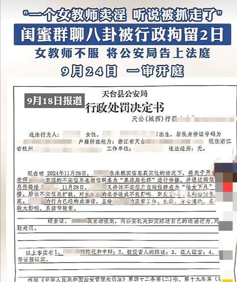 林女士(化名)曾经在一所学校任教,后来虽然离开了那所学校,但依旧和原来的同事和朋友保持着联系。2024年11月26日,她偶然听闻自己原本工作过的学校里,有一位女老师因为涉嫌卖淫被抓了。她觉得这事儿实在是太劲爆了,内心的八卦之火熊熊燃烧! 于是,林女士没多想,就将这一消息先后分享到了两个三人微信群。其中一个群,成员是她的父母,这或许是她下意识里想要和最亲近的人分享这惊爆的新闻。 另一个群,则是她的两个闺蜜,在她们面前,林女士向来是畅所欲言,有什么新鲜事儿都会第一时间分享。她在群里说得绘声绘色,仿佛自己亲眼所见一般,却全然没有意识到,这看似不经意的分享,已经为后续的麻烦埋下了伏笔。 林女士觉得特别委屈,在她看来,自己根本没有传谣的故意。那两个微信群都是自己最亲近的人,她只是把听到的八卦当作日常聊天的话题分享了出去,完全没有想到会造成这么严重的后果。 于是,心有不甘的林女士决定将警方告上法庭,希望通过法律途径来维护自己的权益,撤销这一处罚决定。 这件事很快就在社会上引起了广泛的关注。网友们对此也是议论纷纷,各种观点层出不穷。有的网友认为,林女士确实有些冤枉,毕竟她只是在小的亲友群里分享,没有大范围传播的意图,警方的处罚似乎过于严厉了。 一位网友评论道:“这也就是和家里人、闺蜜随便聊聊,又不是在公共平台大肆宣扬,感觉有点小题大做了。” 林女士一方强调其传播范围有限且无主观恶意,而警方则依据相关法律法规,指出林女士的行为已经对他人名誉造成了损害,必须承担相应的法律责任。 这件事给所有人都敲响了一记警钟。在信息传播如此迅速的今天,每一个人都应该对自己的一言一行负责。即使是看似私密的聊天,也不能随意传播未经核实的信息。 对此你怎么看?欢迎大家在评论区留言讨论。