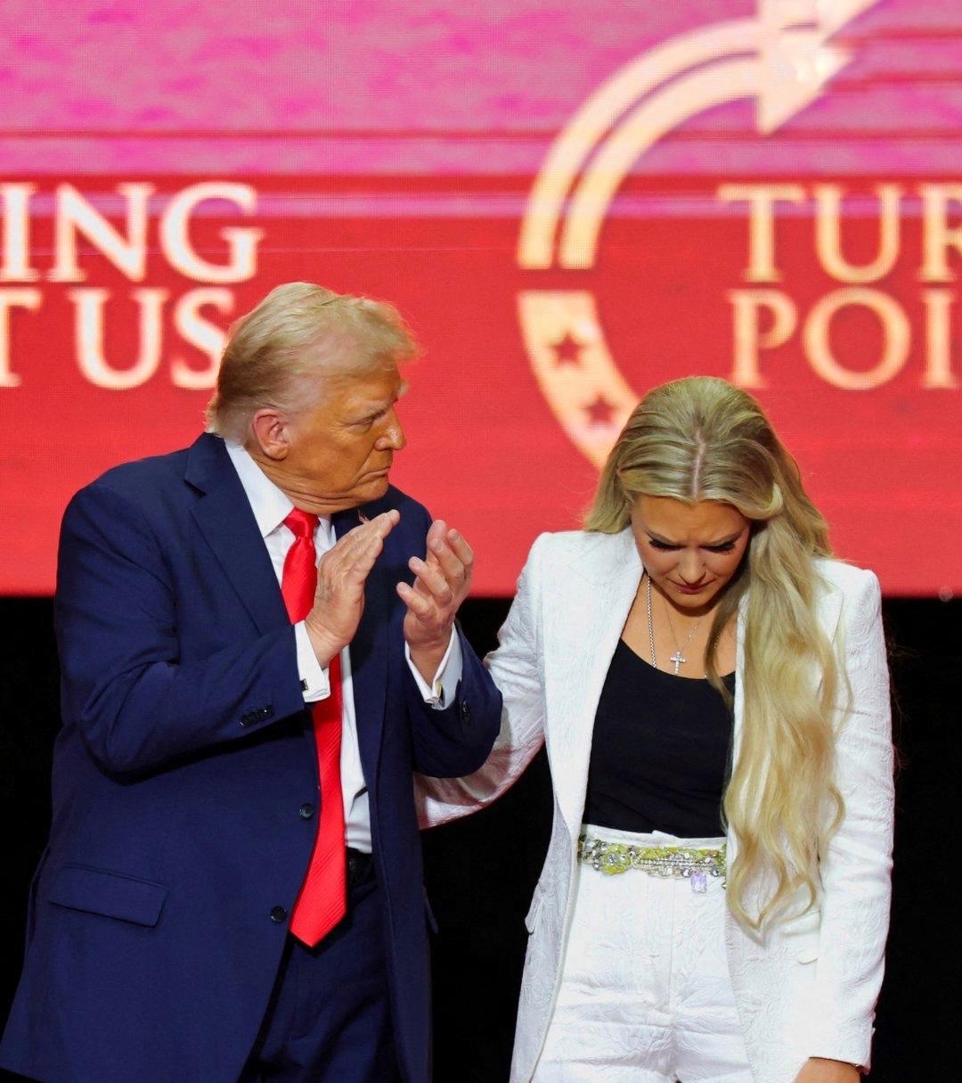 当地时间周日,在亚利桑那州举行的查理·柯克追悼会结束时,特朗普和查理.柯克遗孀埃